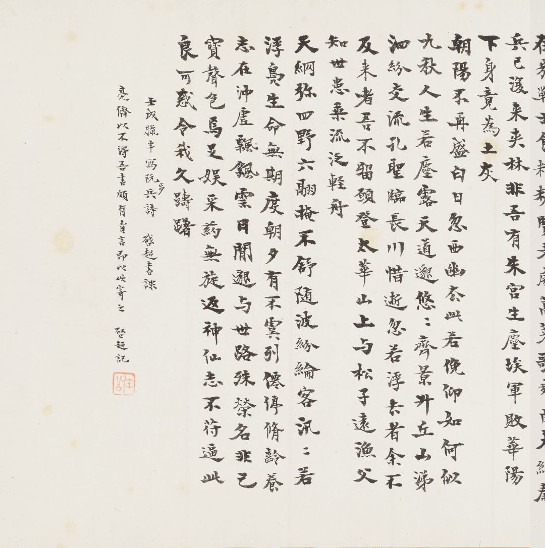 题识:壬戌腊半写阮步兵诗。启超书课。亮侪以不得吾书,颇有责言,即以此寄之。启超记。姚华(1879-1930)题引首:饮冰室书阮步兵诗卷。乙丑上元,为亮侪仁兄署耑。姚华茫茫父。钤印:姚华周大烈(1862-1934)题后纸:阮诗体近曹植,以气格胜。亦如唐之陈伯玉、李太白。构体用意,绝少痕迹。高处在此,不可学亦在此。任公书之,未言所以。亮侪属题其后,偶著近意云尔。乙丑(1925年)岁六月元旦于京寓。钤印:周氏大烈、桂堂周大烈(1862-1934),男,清末民初诗人。字印昆,号夕红楼,湖南湘潭人。曾留学日本。宣统时为吉林民政厅长,民国元年当选众议员,后任张家口税务署监督。曾为陈师曾家塾教师。富收藏。工诗,书法参习北碑,简练古拙。上款:“亮侪”即籍忠寅(1877-1930),字亮侪,自署困斋。直隶任丘端村人。籍忠寅早年随兄长学习,十九岁时,参加童生试,后肄业于保定莲池书院。1902年,以优贡入太学,1903年中举。后官费留学日本,1908年暑假回国,任北洋法政专门学堂教务长。此后,当选顺直咨议局议员、资政院议员。民国后,籍忠寅历任北京临时参议院议员、常任法制委员、常任财政委员、研究宪法委员会委员、天津中国银行副行长、直隶巡按使署顾问、经界局专任评议员、政事堂存记等职务。籍忠寅与梁启超多有交往。1915年,籍参加蔡锷领导的反袁起义,是讨袁运动的发起人之一,他利用社会关系,替梁启超、蔡锷联络冯国璋。反袁期间,梁启超于1915年11月写下《致籍亮侪、熊铁厓、陈幼苏、刘希陶书》,说明以康、梁为首的改良派虽秉持“维持现状”之念,但坚决反对袁世凯再行专制帝制的企图。1917年,张勋复辟,遭到梁启超抨击,籍忠寅又为梁启超联络游说冯国璋。此外,籍忠寅还和梁启超创建讲学社一同邀请杜威、罗素来中国演讲。此卷任公精谨小楷,洋洋千余字,是为梁、籍相交过往之印迹。