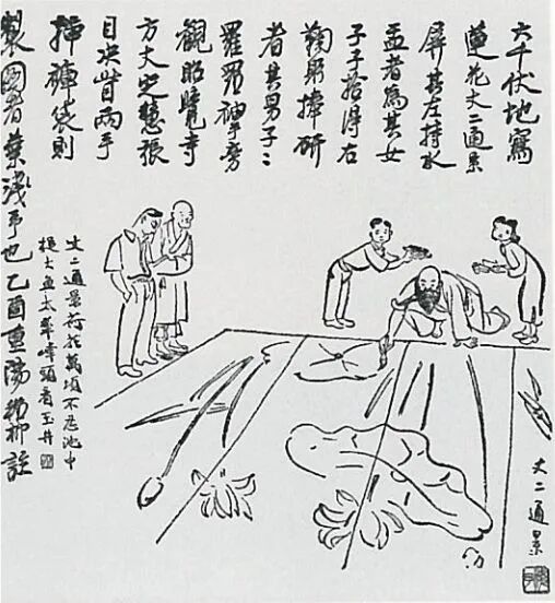 叶浅予画张大千伏地写巨幅