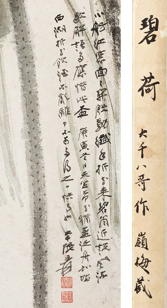 《碧荷》作于1950年秋冬之交,大千先生为筹备画展相关事宜,自旅居之印度大吉岭飞赴泰国曼谷。因事未果,他短暂盘桓即经加尔各答返抵大吉岭。本幅题曰:“庚寅冬日,天竺荷花犹盛,泛舟加城西湖”,“加城”即加尔各答简称。