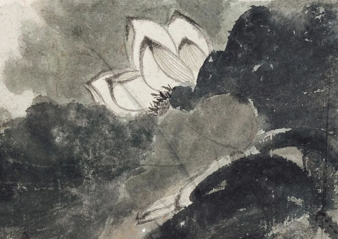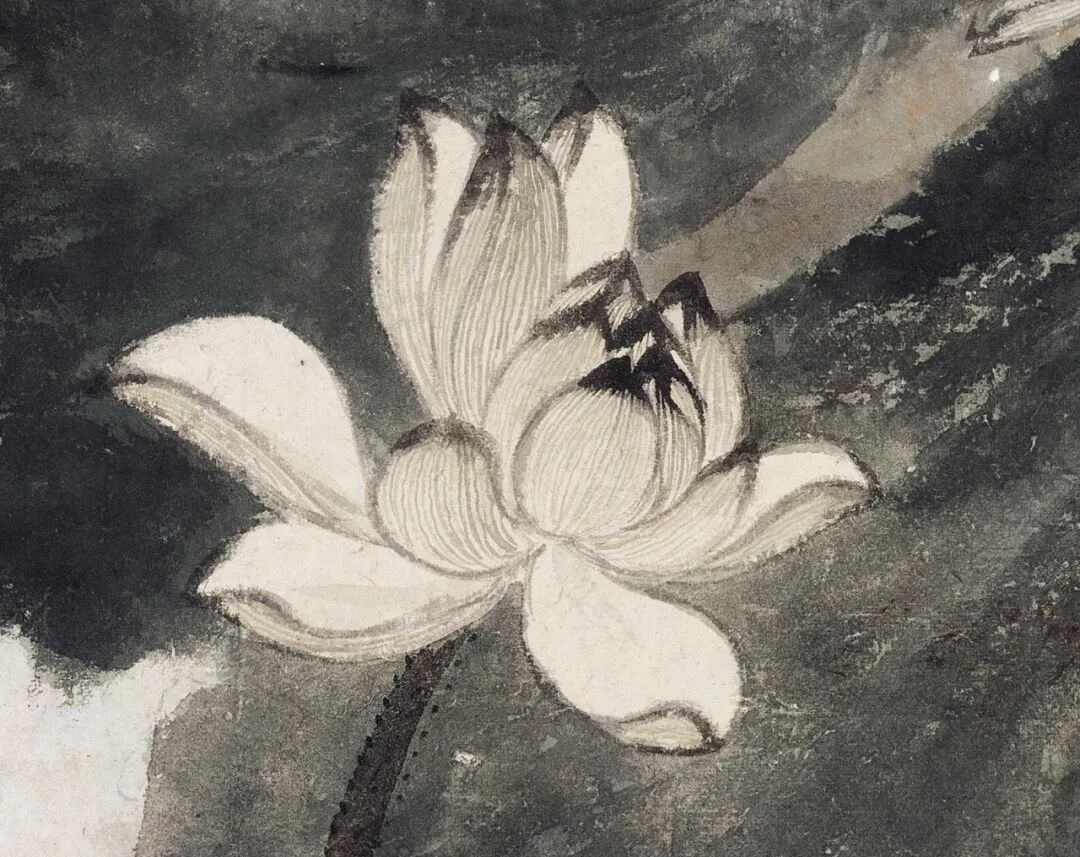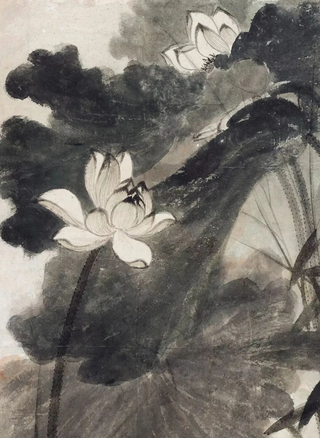画面出诸写意,运墨酣肆华滋,笔势纵横而不失章法。肥厚的荷叶斜下舒展,呈随风摇摆之动态。荷杆则亭亭直上,修长却不绵弱,若隐若现于荷叶交叠处。复用细笔补茎干上散生小刺,分布均匀且不繁赘。