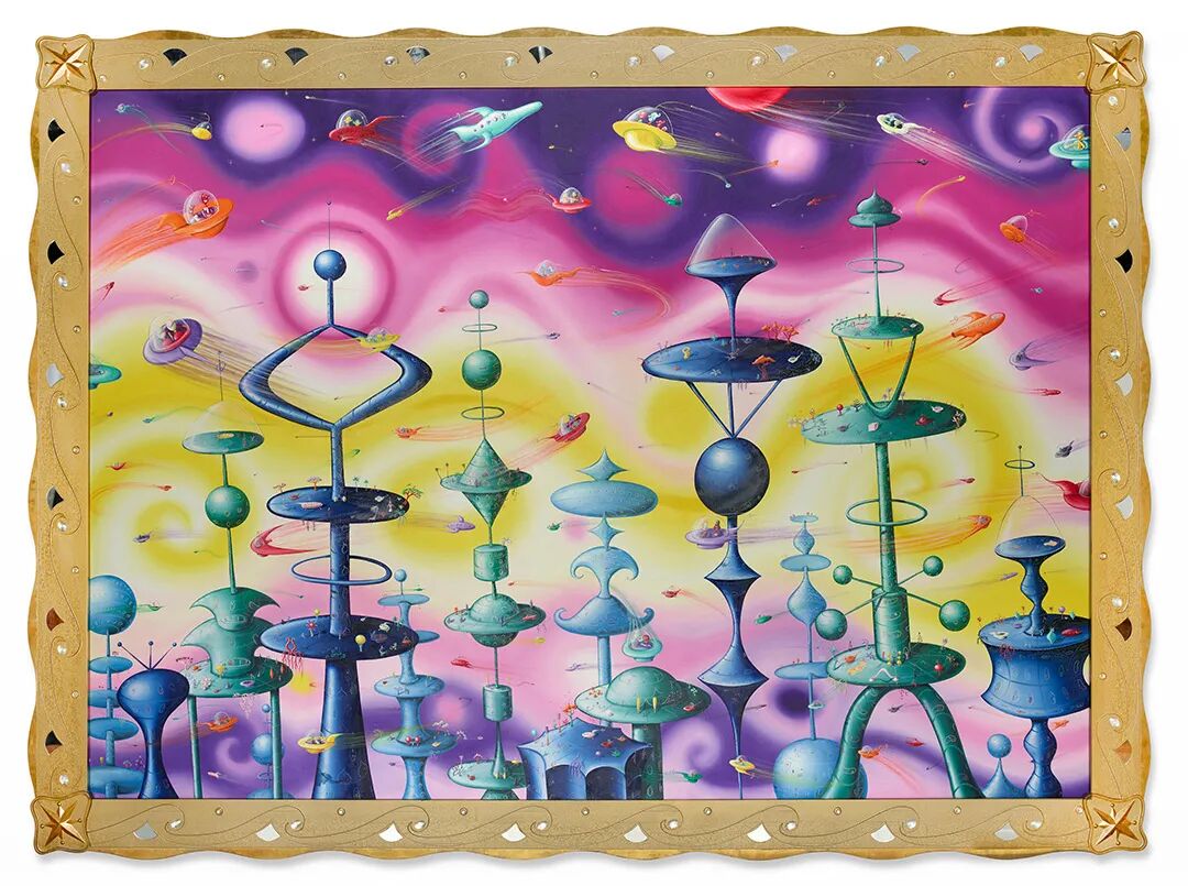 上世纪 80 年代纽约艺术界另一位重要人物肯尼·沙夫(Kenny Scharf,生于 1958 年)的画作也将出现在拍卖会上,这无疑是拍卖会上尺幅最大和最壮观的一幅画作。《City of the Future》(未来之城)是一幅标志性作品,体现了沙夫标志性的“波普超现实主义”风格。![]()
