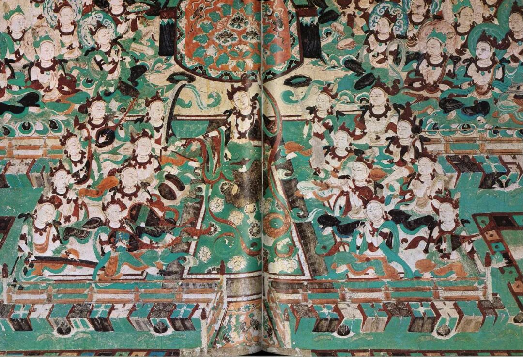 这些形象,能在敦煌壁画中找到原型。如敦煌第八十五窟北壁东侧《思益梵天请问经变局部 · 舞乐》(参考图1),手相、饰物、乐器,皆可参考。除样式的借鉴,风眠更将重点放在颜色的运用。本幅大部分乐女的裙衫以赭为主基调,而领口、飘带、袖口处,则用深一色度的熟褐或紫,当需要表现薄纱的轻盈飘逸时,则罩浅一色度的黄或粉白。画面中心,一位背影仕女格外抢眼,她是唯一着蓝色冷调的乐人。而蓝褐的对比,亦可见于敦煌壁画,如二四九窟北壁《说法图》局部(参考图2)及三九〇窟《伎乐天》。画家既大胆,又克制,在冷暖并置,反覆平涂中,画面被赋予微妙、丰富的层次感,达致完美的平衡与和谐。