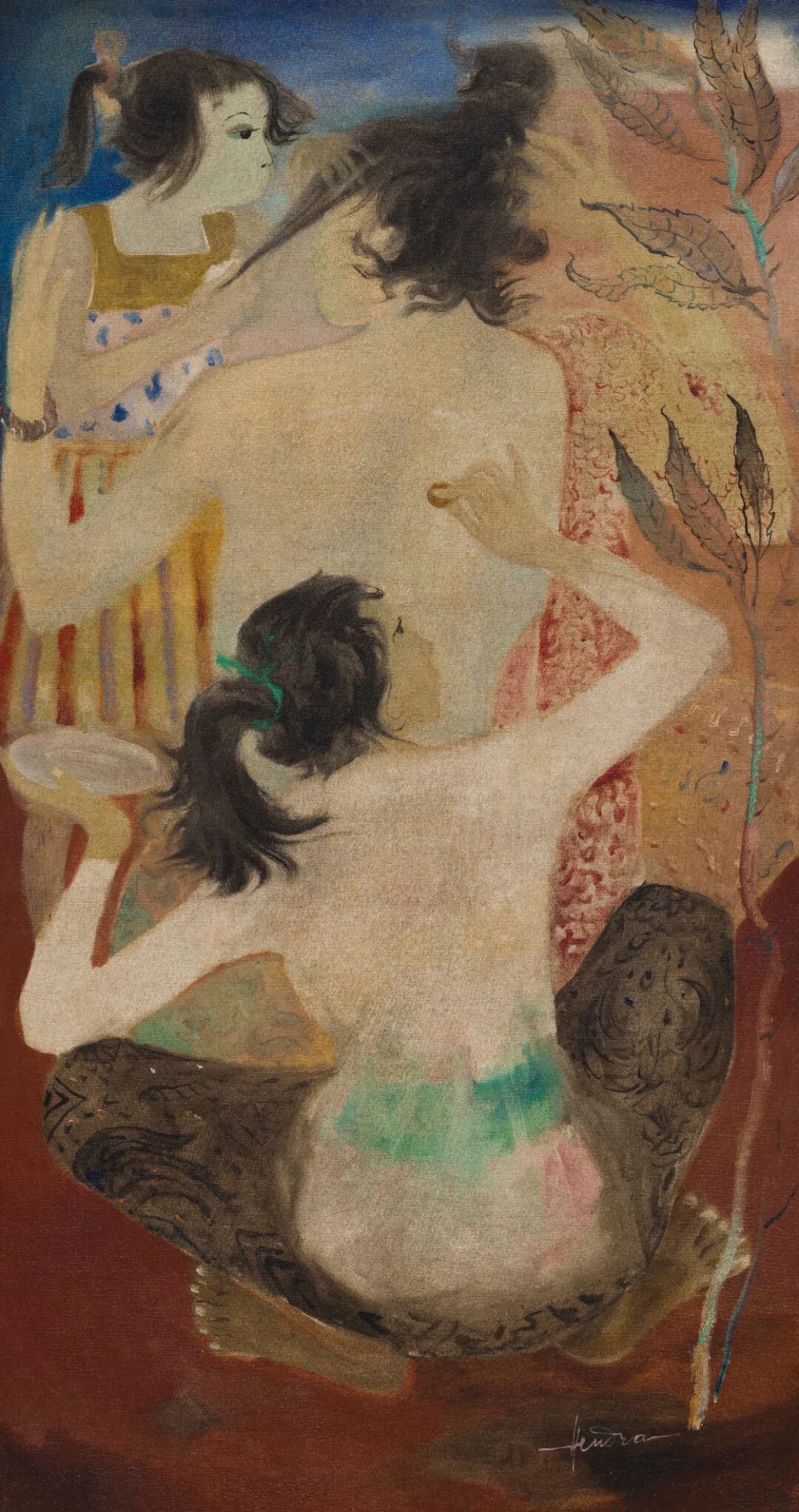 亨德拉·古纳万是上世纪印尼现代艺术家当中的翘楚。《刮痧》约于1956年间创作,此画描绘印尼的传统民间疗法,即在背部涂抹润滑油,然后用硬币摩擦后背,以此缓解身体不适。古纳万是唯一以刮痧主题入画的印尼艺术家,而此特殊题材亦成为其最重要的创作系列之一。订阅邦瀚斯微信、视频号和小红书,了解更多“东南亚现代及当代艺术”拍卖内容。