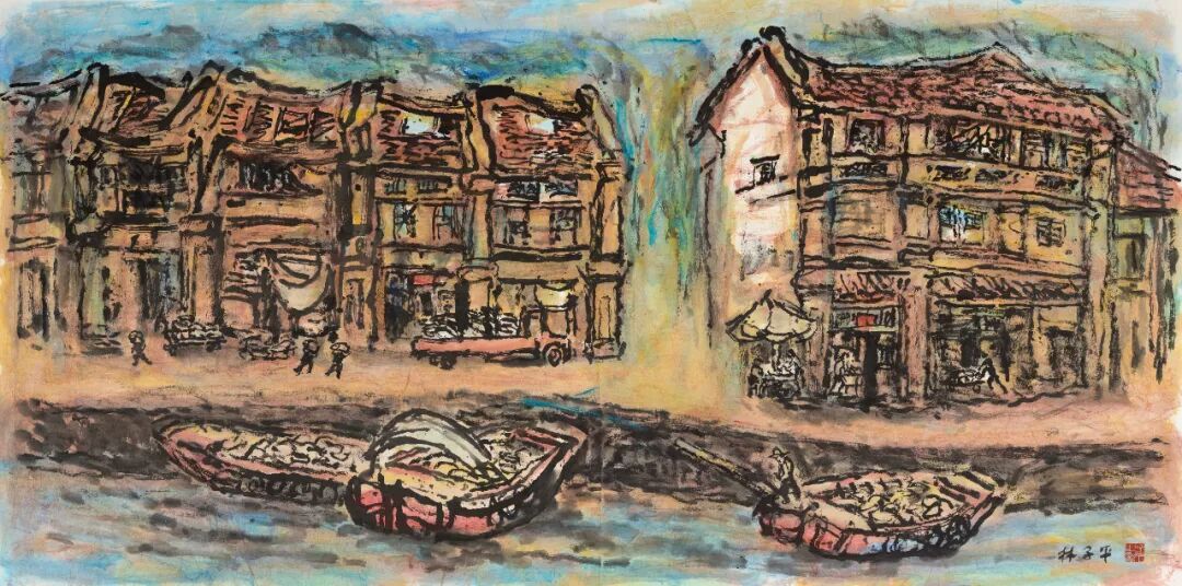 林子平独具风格的作品结合书法、中国水墨和油画等元素,展示其融合传统和现代风格的创造力。巨幅作品《新加坡河》是林子平近期的佳作。此画用笔大胆雄健、色彩鲜明,即兴而流畅的笔触令作品洋溢着明快的神采。![]()