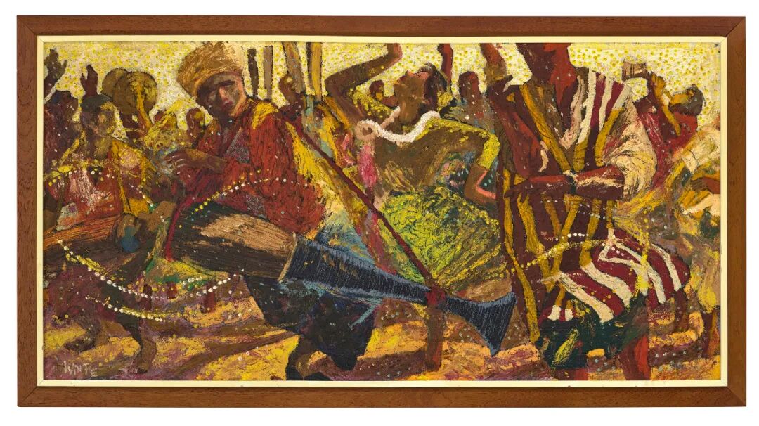 温佩是缅甸目前仍活跃于艺术领域的国宝级艺术家。《泼水节》创作于1961年,当时温佩是希维斯坦教授在缅甸曼德勒大学的学生。这幅画作原是为了当地庆典活动而简单绘成的海报,希维斯坦非常欣赏并鼓励温佩将其发展成一幅完整的油画作品,最终更购入此画。![]()