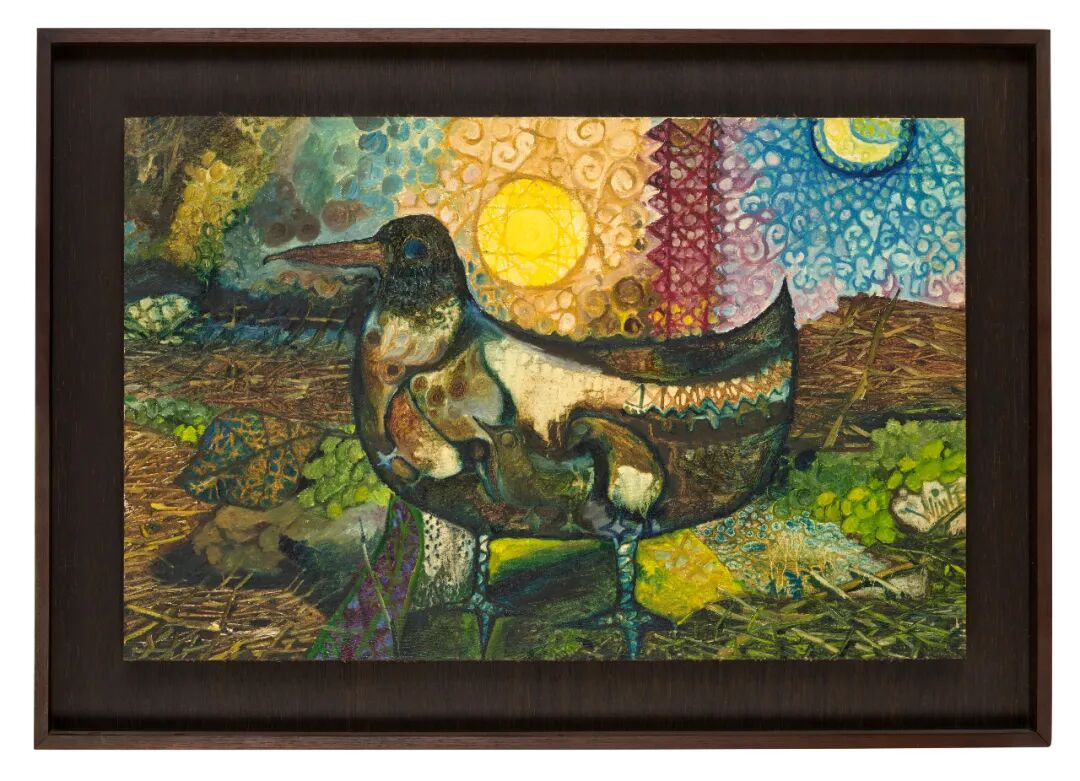 缅甸著名艺术家温佩的作品见证这个国家在过去半个多世纪的社会与政治变化。缅甸神话中的神鸟Hintha常见于缅甸的文学与艺术当中。缅甸人相信这种鸟拥有预见未来和过去的能力,并能从凡尘中解脱,进入佛陀世界。在这幅极富象征意义且色彩绚烂的作品中,画中的神鸟带着数只鸟在日与夜之间穿梭,其生生不息的力量体现艺术家对缅甸美好将来的期盼和希望。![]()