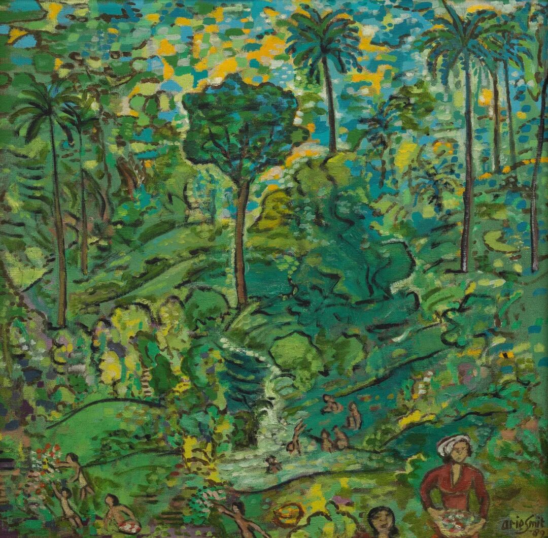 《儿童嬉戏》是阿瑞史密特在其艺术创作巅峰时期所作的一件令人赏心悦目的作品。此画以深浅不一的绿色主调呈现画家心目中的峇里岛动人风景。史密特以大胆的线条构图,让这幅作品充满生命力。树、花、山、水据满整幅画作,儿童和妇女在此平静和谐地生活着。《儿童嬉戏》生动描绘热带自然环境与居民间的互动,体现阿瑞史密特对于壮丽大自然的景仰。![]()
