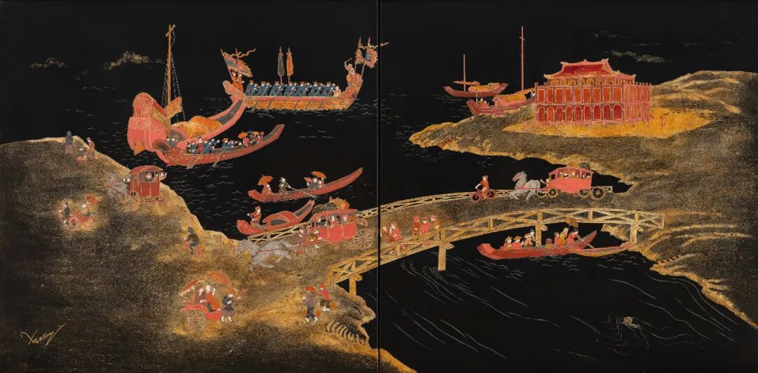 阮康与越南漆画大师范光厚、阮嘉治和陈文瑾皆在越南近代漆画艺术的发展历程中扮演重要的角色。《龙屋港》饱含越南之民族认同感,此画描绘位于滨义河道和西贡河交汇处的龙屋港,但其构图乃是画家想象中的场景。此画右上角的建筑物“龙屋”在1862年至1863年间建造而成,最初作为法国船运公司Messageries Maritimes在西贡的总部,如今此处已成为胡志明纪念馆。![]()
