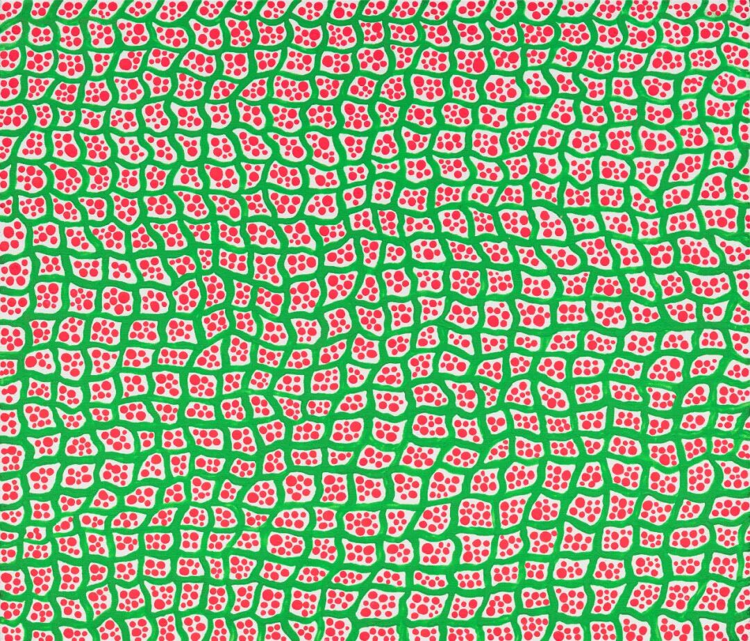 草间弥生无疑是当今最有影响力的当代艺术家之一。从20世纪80年代中期开始,她的创作便以利落分明的线条与对比鲜明的色彩为标志,作品充满朝气与动感。这幅创作于1988年的作品题为《蒙特利尔之光》,囊括了所有以上特点。草间弥生从20世纪50年代开始创作“无限之网”(Infinity Net)系列,在画面上以绿色线条构建了一张网状结构。画中的网眼形态多变,其中充满了桃红色的波点,不禁让人联想到有机细胞的繁殖;或者如作品标题所暗示的那样,仿佛无数的灯光穿过熙熙攘攘的城市天际。网点的节奏感赋予了《蒙特利尔之光》生生不息的活力。![]()