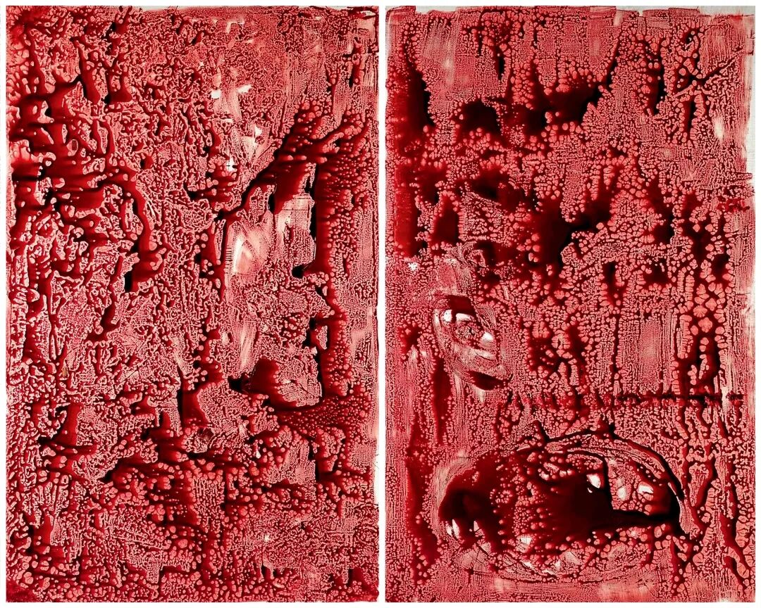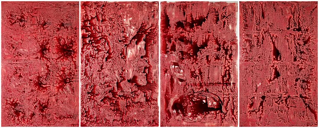 此次呈现的《禁色》系列绘画是艺术家为2019年在香港唐人当代艺术中心的亚洲首个展——“解锁”特别创作的作品。抽象画布上所蔓延的血液是借用了影视制作中用来逼真模拟伤亡人员所用的液体。洒落的色彩在画布上渗透,彼此叠加,好似每天不断产生的暴力,它们穿越界限,存在于世界的各个角落。四联作的巨幅尺寸彷彿是呈现人类历史的壁画,见证了暴力是何等的普遍,是如何成为受人操纵的工具,给人类带来无限的苦难。