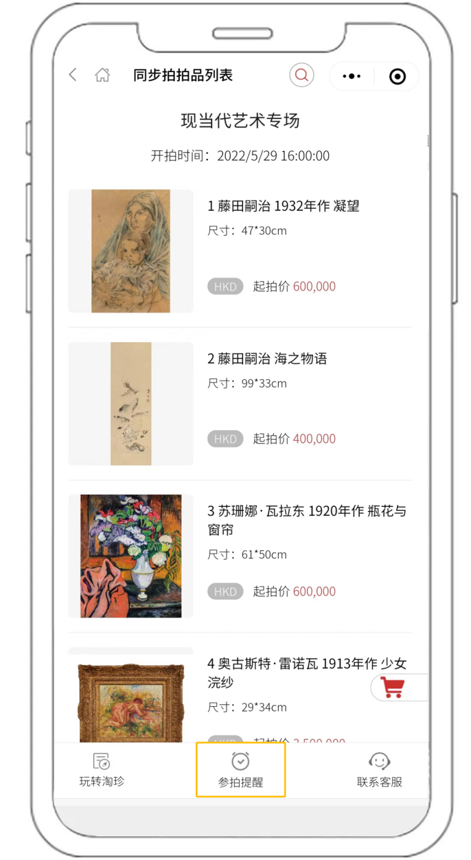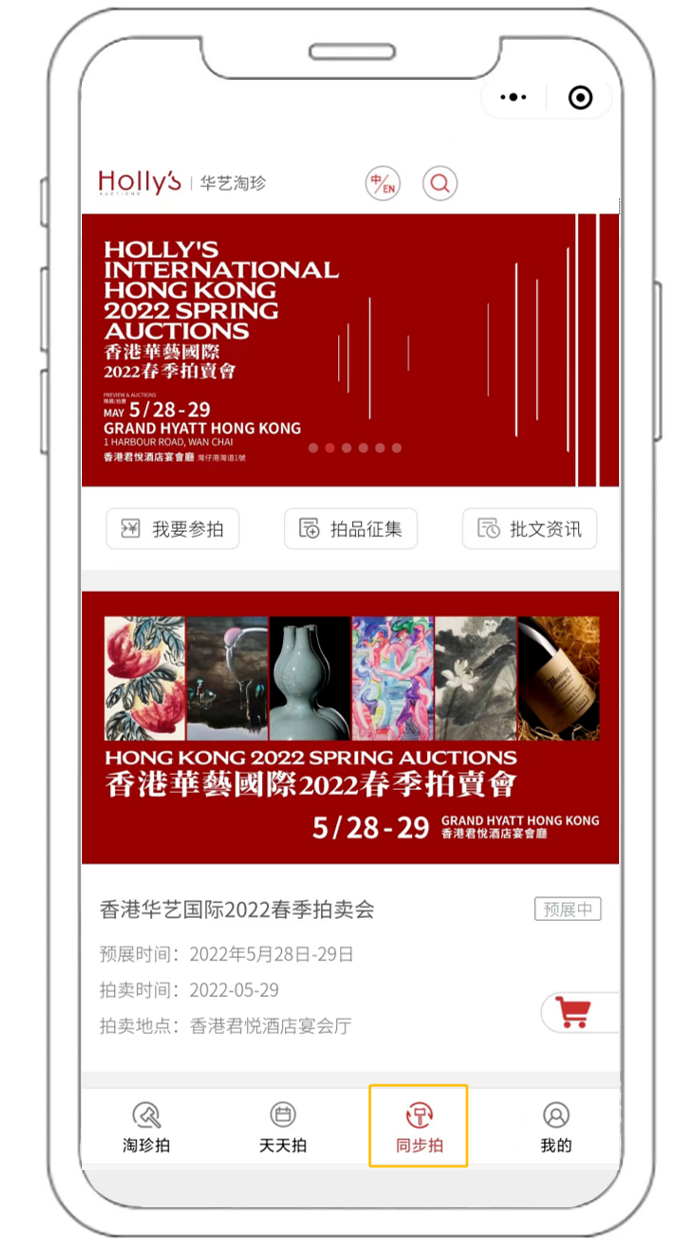 进入华艺在线APP或华艺淘珍小程序首页,点击底部“同步拍”即可进入香港华艺国际2022春季拍卖会页面。