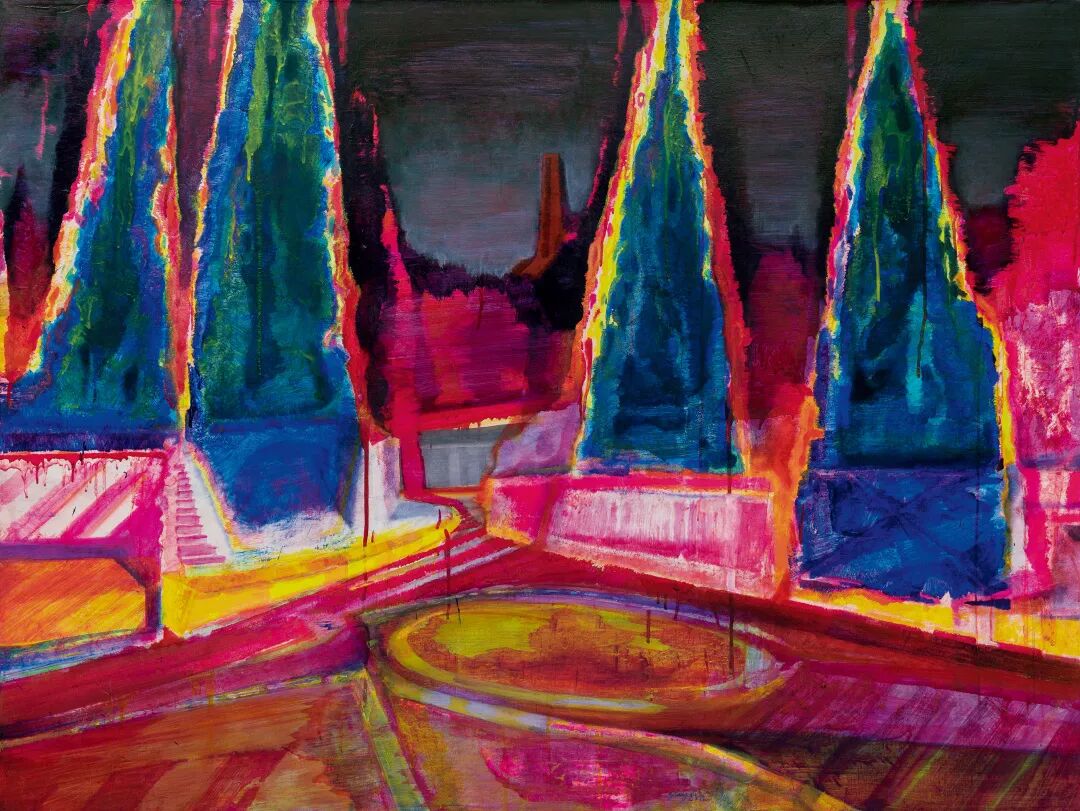 作为中国最炙手可热的70后艺术家,黄宇兴在近二十年创作生涯中,他对绘画语言的探索一直围绕个人生活的际遇和经历,并渐渐发展成将传统色与大胆的萤光色结合的鲜明个人风格。2011-2012年,萤光色开始占据整个画面,具体的形象也被解构成旋涡状的椭圆形以及锥形体的抽象色块,这个阶段的系列作品是奠定其现今风格的“树丛”系列,《树丛》便是这个系列的作品之一。几何切割的锥形体如同树丛树立在某个被虚构的公共场所中,背景中暗紫色的油彩与丙烯流动,桃红色的建筑上的金黄点亮轮廓,荧光色彩的特质加上艺术家对冷暖色的把控,构建了抽象化的支撑结构。黄宇兴用绚烂的荧光色重新定义了何为“风景“,画面背后是对当代精神性的语言探索和对生命的终极追问。