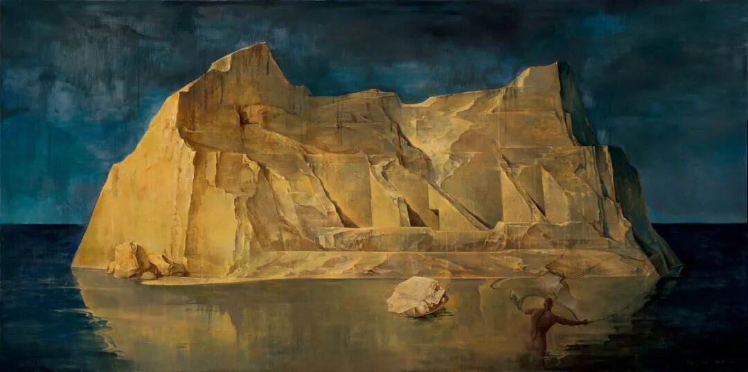 作品《金山》,图式来源于勃克林(Arnold Bcklin)的画作《Island of Death》,章犇以一座金山和前景中不完整的石像(取材北齐青州龙兴寺造像)代替了原作中的石头岛屿,金色的遗迹引发了人们对于历史的想象,同时海上孤山的形态所对应的是汉代以来蓬莱仙山的视觉模式。在典型的欧洲浪漫主义视野中,金山的隐喻象征着转瞬即逝和对时间的执着,景观因而化为不朽的痕迹和坚实的永恒。