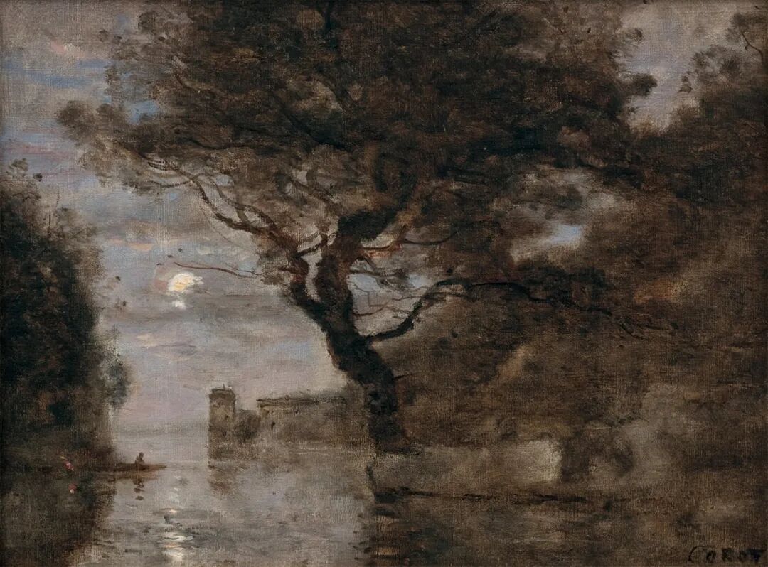 这件约1870-1875年间创作的作品《意大利的月》属于柯罗晚年经典之作。银灰色和褐色的调子,使夜晚的月光具有宁静感,弥漫的雾气也更富诗意,画面显得透亮空灵。用笔方面,相比之前细腻的笔触,即兴式写意也受到了同时代印象派相互交融的影响,描绘出珍珠灰色的夜空,谱写一幕月光下动人的宁静夜景。
