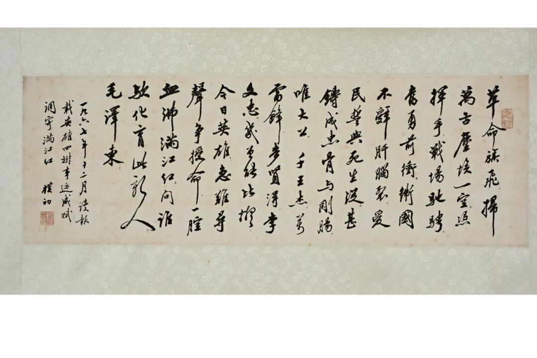 款识:一九六七年十二月读报载英雄四排事迹成赋调寄满江红,朴初。