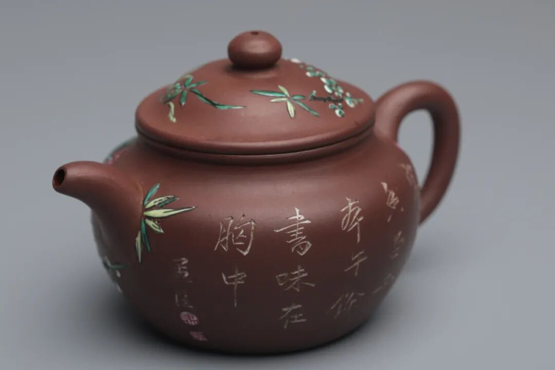 说明:拍品胎质细腻,色彩艳丽,壶体呈扁腹型,直口,短颈,管状流,环形把,圆盖宝珠钮,造型古朴典雅,线条流畅和谐,具有大俗大雅之美,殊为难得。