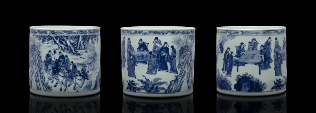 外壁通景描绘十八学士在幽静的场景下,芭蕉、竹石、群卉相伴,或围坐听琴,或观赏画作,或下棋对弈,四周童子随侍,一派恬淡的世外情怀。画面中二十一人的年龄、衣饰、神态各异,但都刻画生动,极为传神。青花发色艳丽,画工精细,画面格调高雅,具有浓厚的文人气息,清初满族政权为笼络汉人士大夫阶层,于康熙十七年(1678年)开博学鸿儒科,采用荐举与考试相结合的方法,效仿唐太宗,招贤纳士,在此社会背景下,于瓷器上绘制文人学士图成为一时之风。此件笔筒不仅为康熙时期青花文房器之佳作,抑且是所见类似画意中的精品。