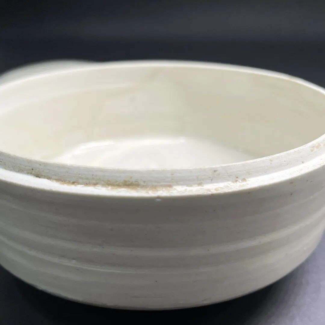 盒盖向上微拱,直缘;盖身亦直缘,下腹斜收,平底无圈足。整器光素无纹,上下盒盖则吻合无虞。内外施透明釉,略失透,再白色胎体映衬下色泽米白,质地温润。釉层较薄,器表面尚可见旋坯痕迹,盒下腹「挂泪」,足底露胎,胎质白实。