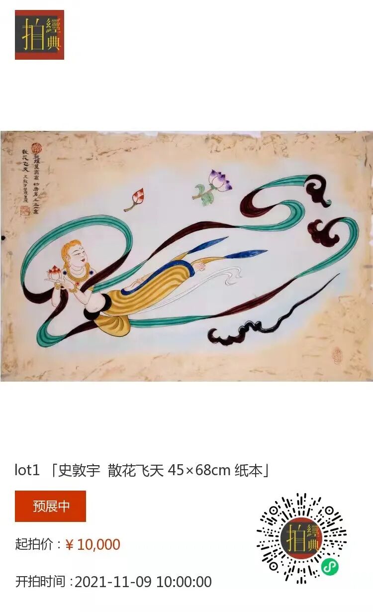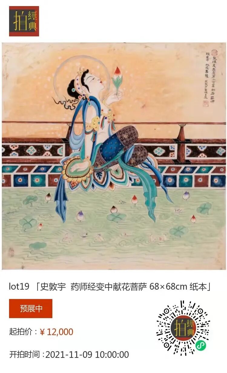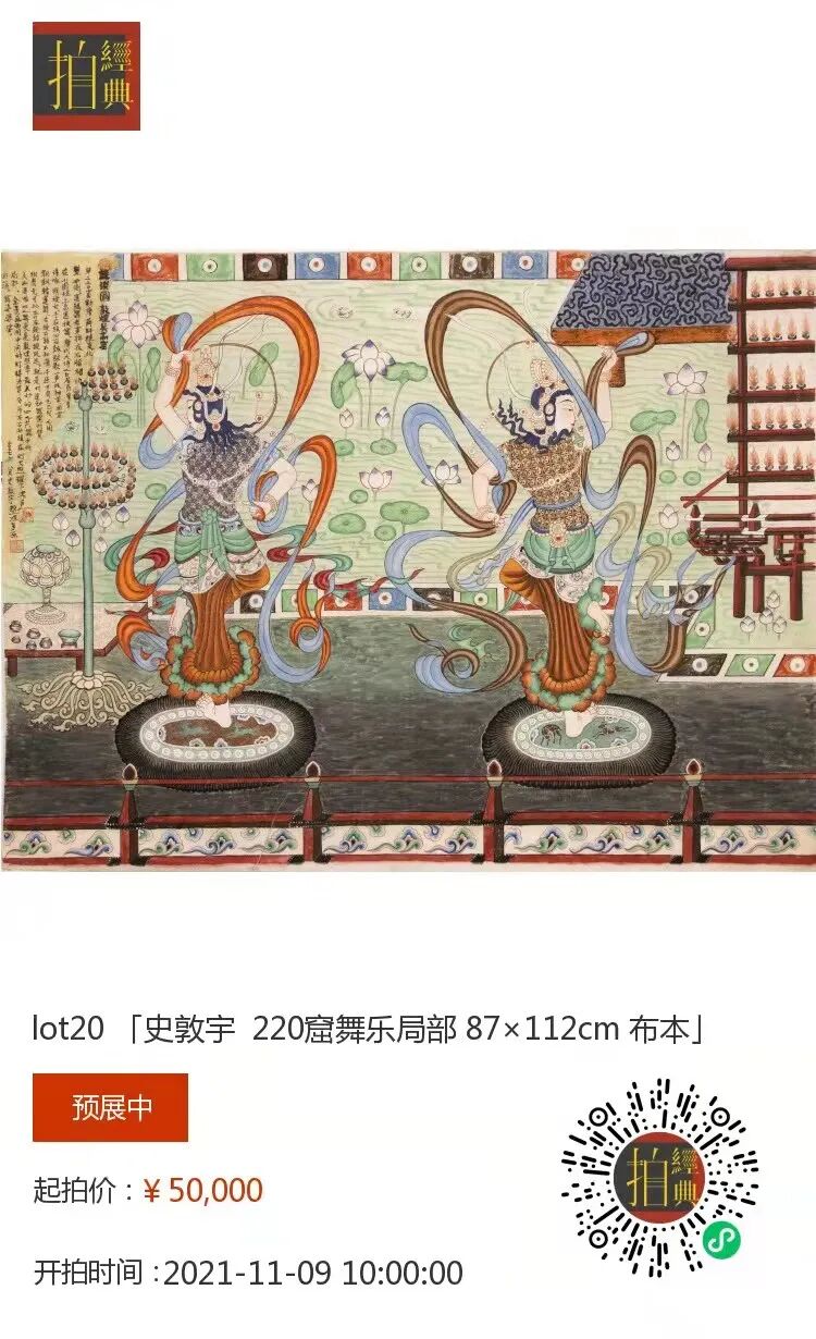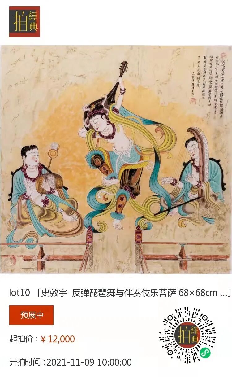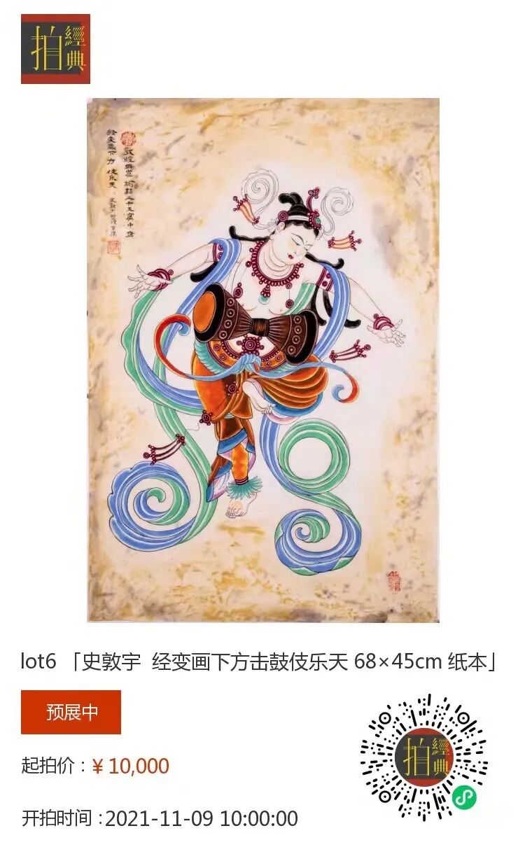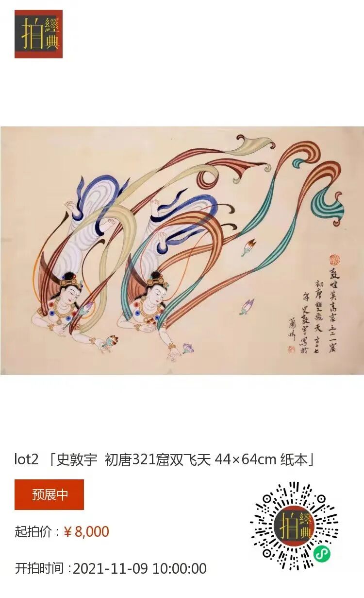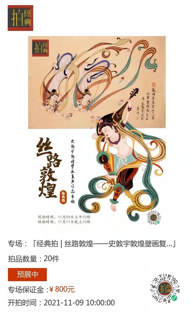 本期【经典拍】特别推出“丝路敦煌——史敦宇敦煌壁画复原作品”专场,共甄选史敦宇老师20幅精品佳作,画种包括飞天、舞乐、尊像画、故事画等多种题材,以纸本、绢本、布本三种形式绘制,向喜欢敦煌艺术的人们展现真正的敦煌壁画临摹品。本场拍卖佣金所得,将全部捐给南京普光寺,用于助建重修。