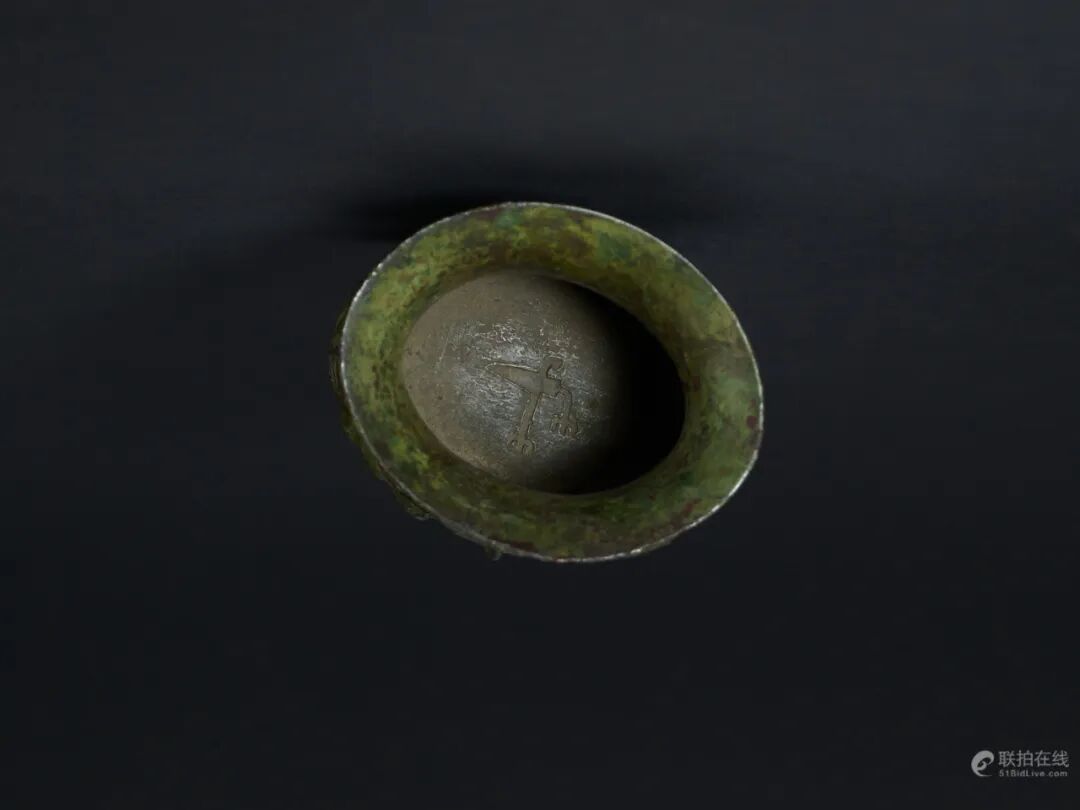 大家看一下这个里面是它的铭文,一个“戈”字,就像戈的象形一样,是一个族徽,这件另外一个有意思的地方是它的底部,它的圈足里面是加强筋,一般青铜器所见的加强筋就是网字形的,这一件加强筋像两个兽首一样,也是有两个兽面的形状,非常特殊。