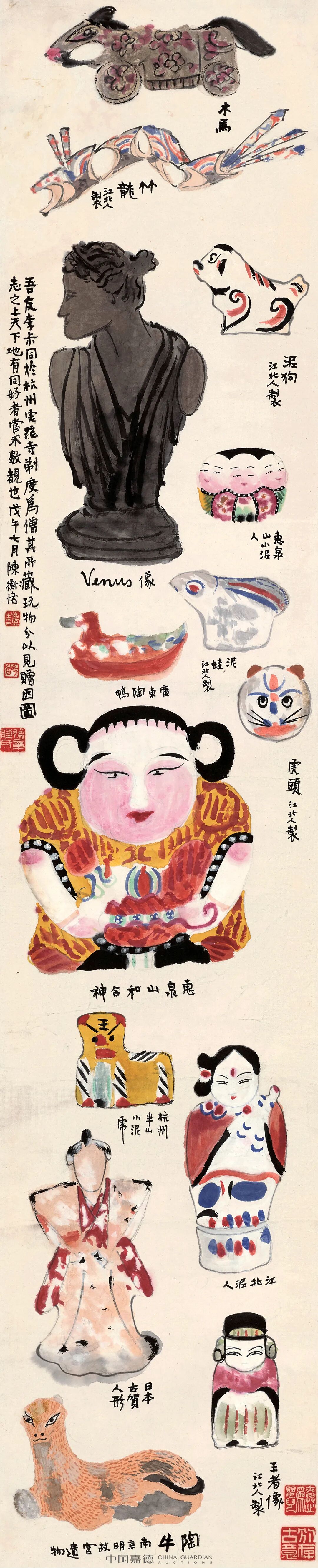 据陈师曾之子陈封雄描述:“十年动乱”期间,李叔同所赠维纳斯像损毁,《息翁玩具图》与诸多泥偶玩具也自此沧江虹散,六十年来不知所踪。《息翁玩具图》便是陈师曾的艺术生涯里这样一张“神龙见首不见尾”的名作。它的传奇经历多次著录于研究陈师曾的年谱,文献,史料之中。其重要程度或可与陈氏《北京风俗图》,《读画图》两大代表名作等量齐观,然因为特殊的历史原因,导致了《息翁玩具图》虽然声名在外,众口相传。但受困于图像资料的缺失,让这幅作品一直以来未能得到深入的研究与解读。![]()