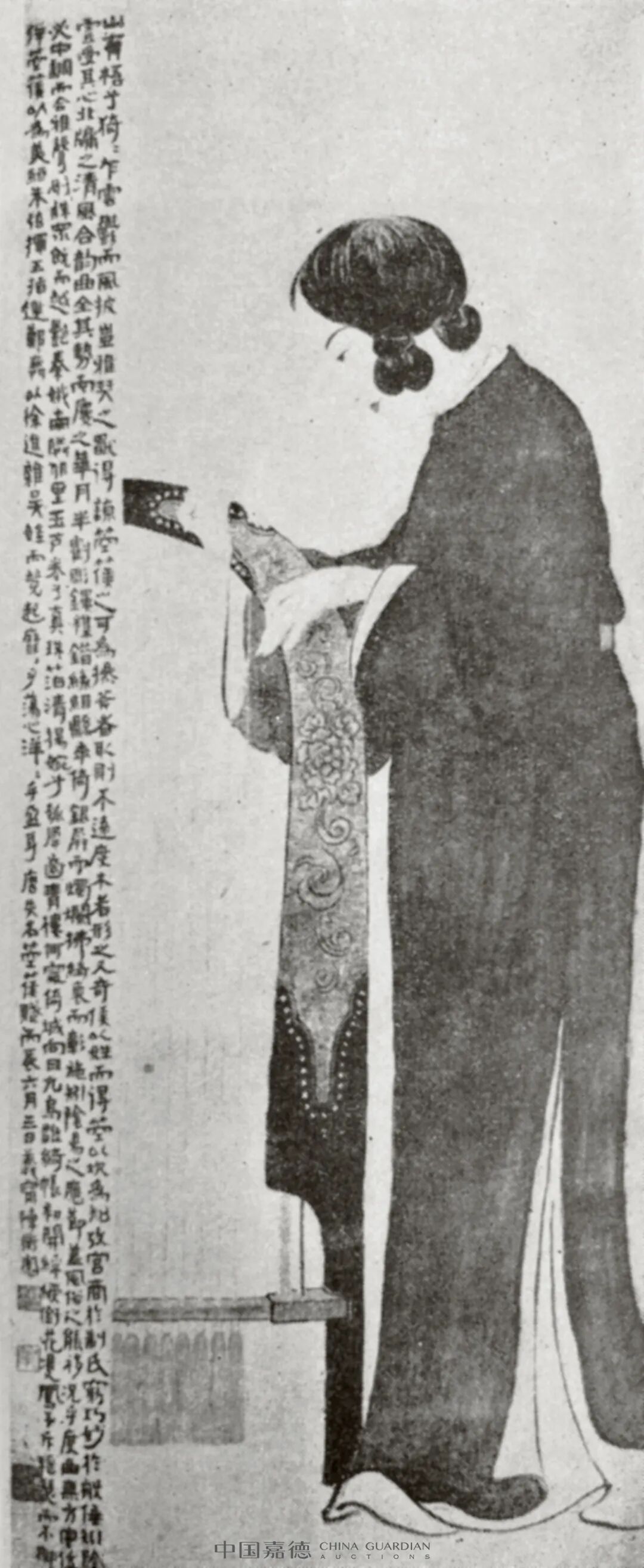 尽管陈师曾在民国时期名动一时,但因天不假年,故其存世作品不多。即使是公立机构中的馆藏作品,也大多只限于山水、花木两大题材,其人物画与文人风俗绘画存量极少,《息翁玩具图》更属独一无二。画中的款识并非以陈师曾所常见的行草书写,而用看似稚拙的楷书长跋。之所以采用此类书风,是为了与画中所绘的玩具题材气质相合,拙中见巧,大有意趣。此类书体的款识虽不多见,但是在陈师曾两大名作《箜篌仕女图》(1914年作,中国美术馆藏)与《读画图》(1918所作,中国美术馆藏)相比,在落款书体上都展现出极高的一致性。尤其是与《箜篌仕女图》对比,用印顺序与排布习惯都完全吻合。而陈师曾自题的“息翁玩具留真”签条,则可与数年前苏富比释出的陈半丁旧藏齐白石《竹鸡图》(上世纪三十年代出版)中的陈师曾签条进行对照,无论书写风格与签条材质都如出一辙,可堪确认。《息翁玩具图》的旧藏者为英国著名的古董收藏家,其家族于上世纪六十年代于自北京文物商店之中购得此作,其后六十年间一直于藏诸海外,其装裱形式也与当时的文物店书画装裱相吻合,可作为侧面佐证。至此,《息翁玩具图》一百年来的前后因由清晰可考,实谓流传有序。