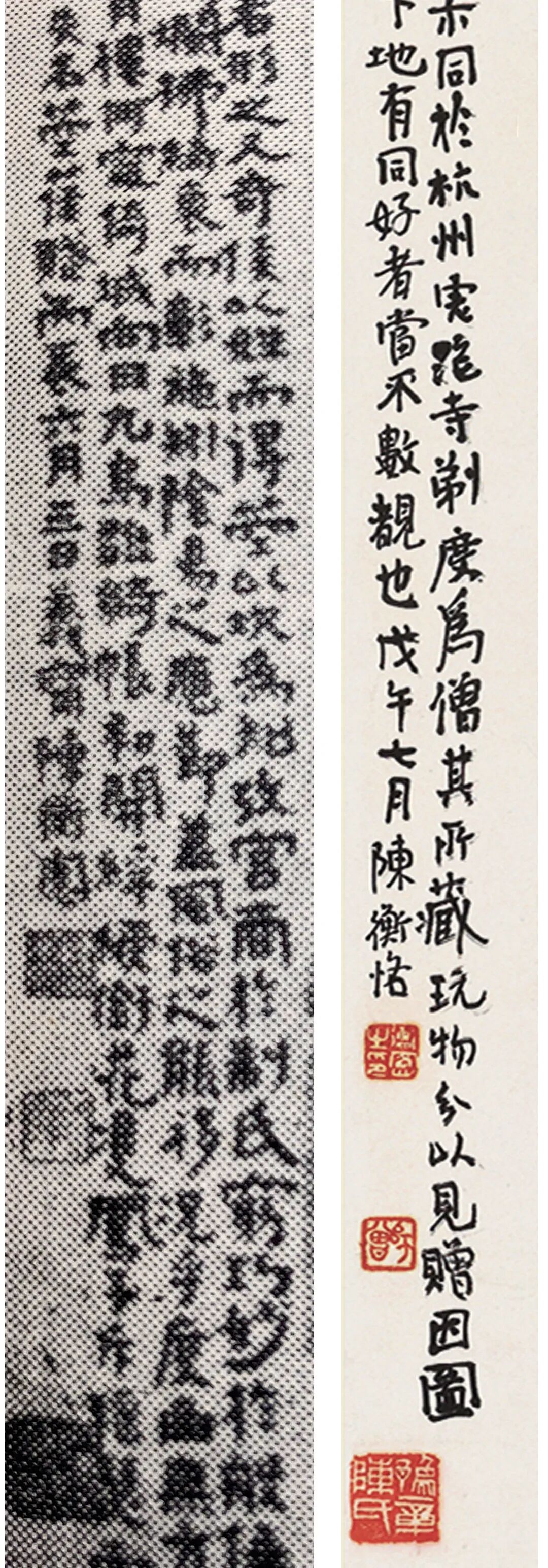 左:陈师曾为齐白石在世出版中《竹鸡图》所题签条。右:《息斋玩具图》所题签条。二者相比,材质与书写风格上高度一致。