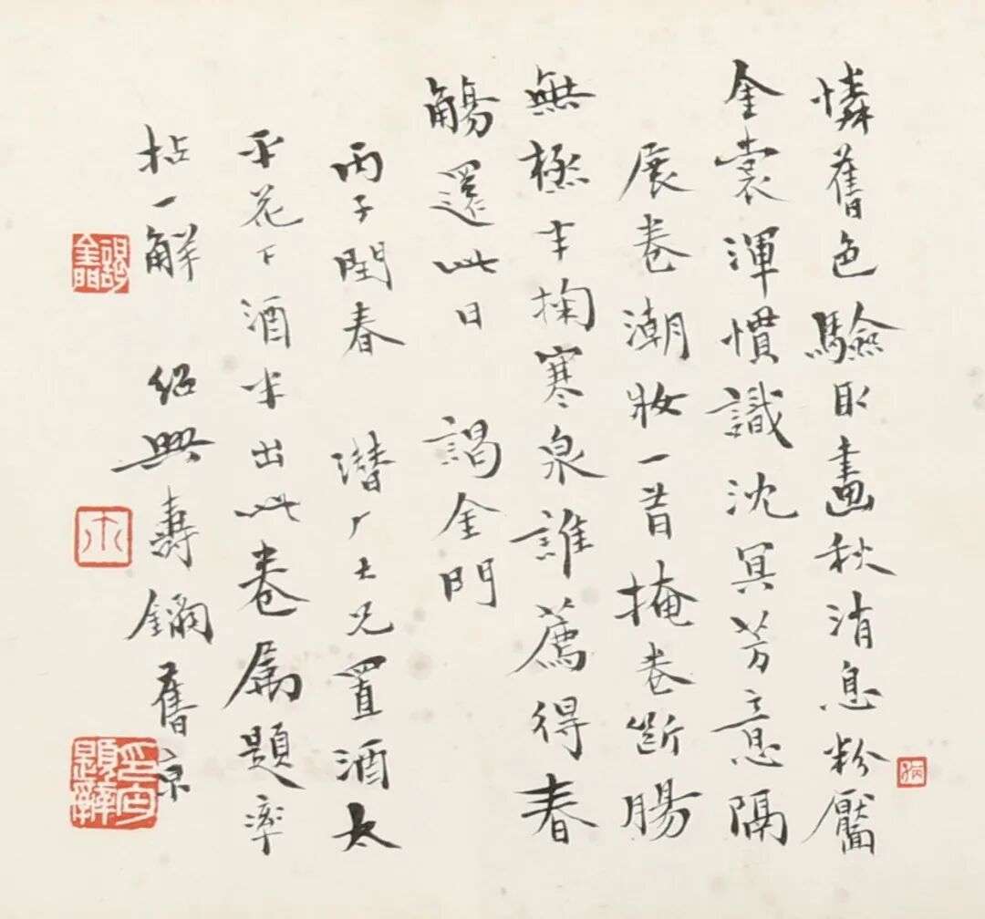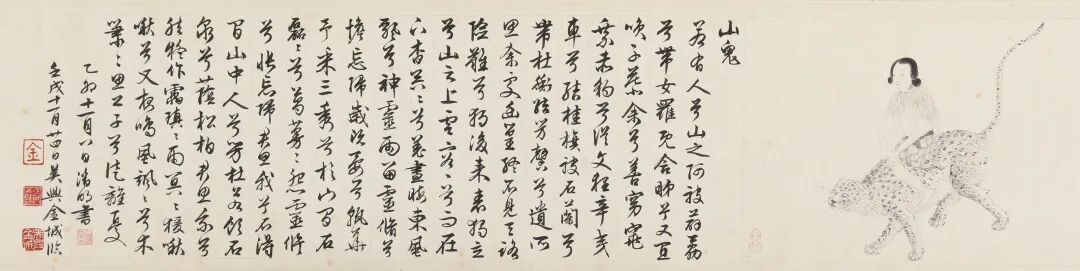 從引首至跋尾,金城一人分飾王穀祥、文徵明、王岱、彭兆蓀、孫均等多個角色的闹中取静。作者除將原本中的人物、翎毛進行臨寫以外,亦對其上的跋文、題詠進行了亦步亦趨的臨摹,篆書、行草、小楷各臻其體,展現出了超凡的書法、繪畫臨摹能力。這種看似平實的表達,卻將作者的書畫造詣展露無遺,可謂是在表現手法上的「復歸平正」,於無聲處聽驚雷。