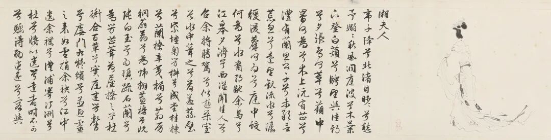 而《通臨文徵明〈九歌圖〉》的創作手段 —— 臨摹,作為書畫學習與沿襲的重要方法和路徑,在創作動機上顯然變得嚴肅了許多,整卷自引首至跋尾也都充斥著一絲不苟的「致敬」和「思考」的態度,體現在情緒上,則更加低沉、恬靜。
