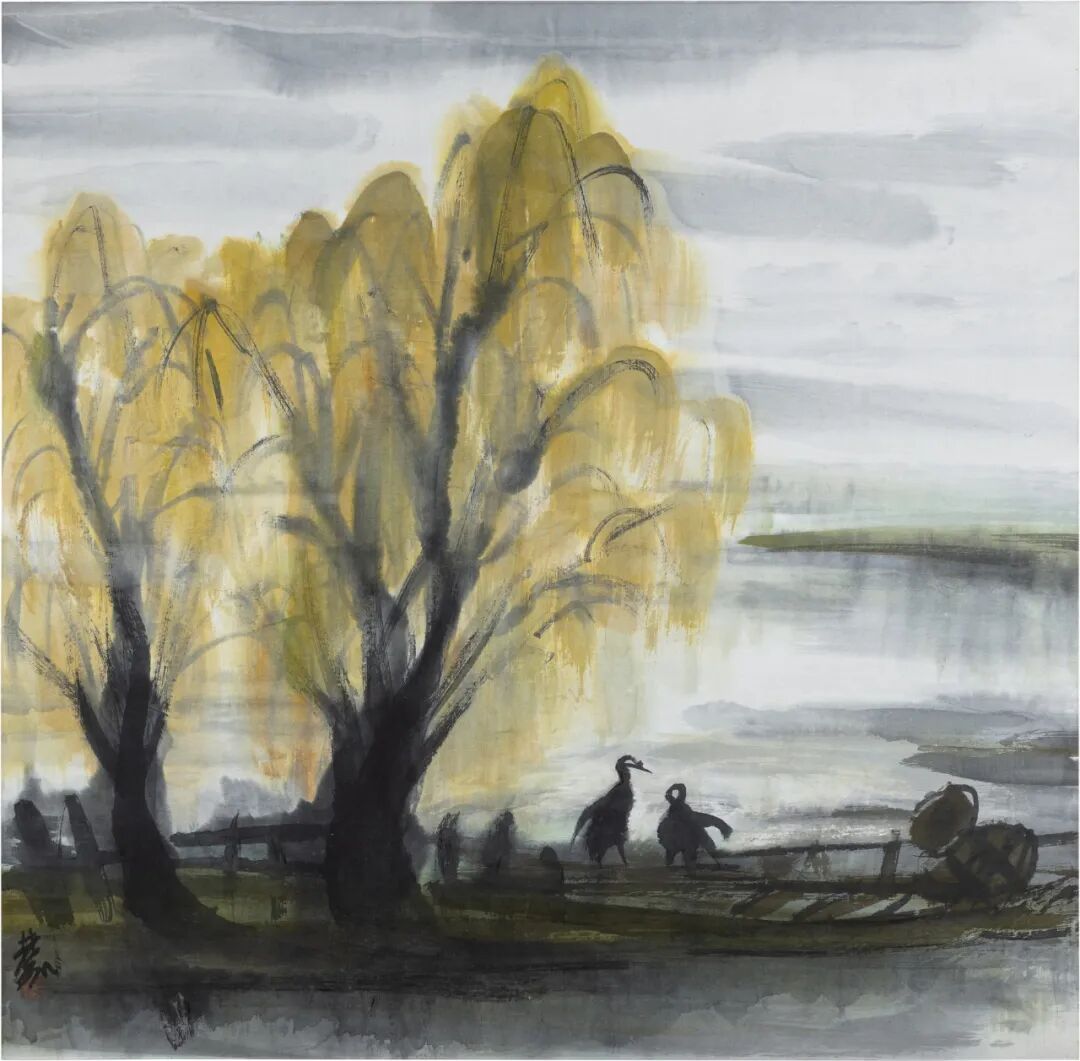 Lot 155 清康熙 青釉开光青花山水人物纹觚