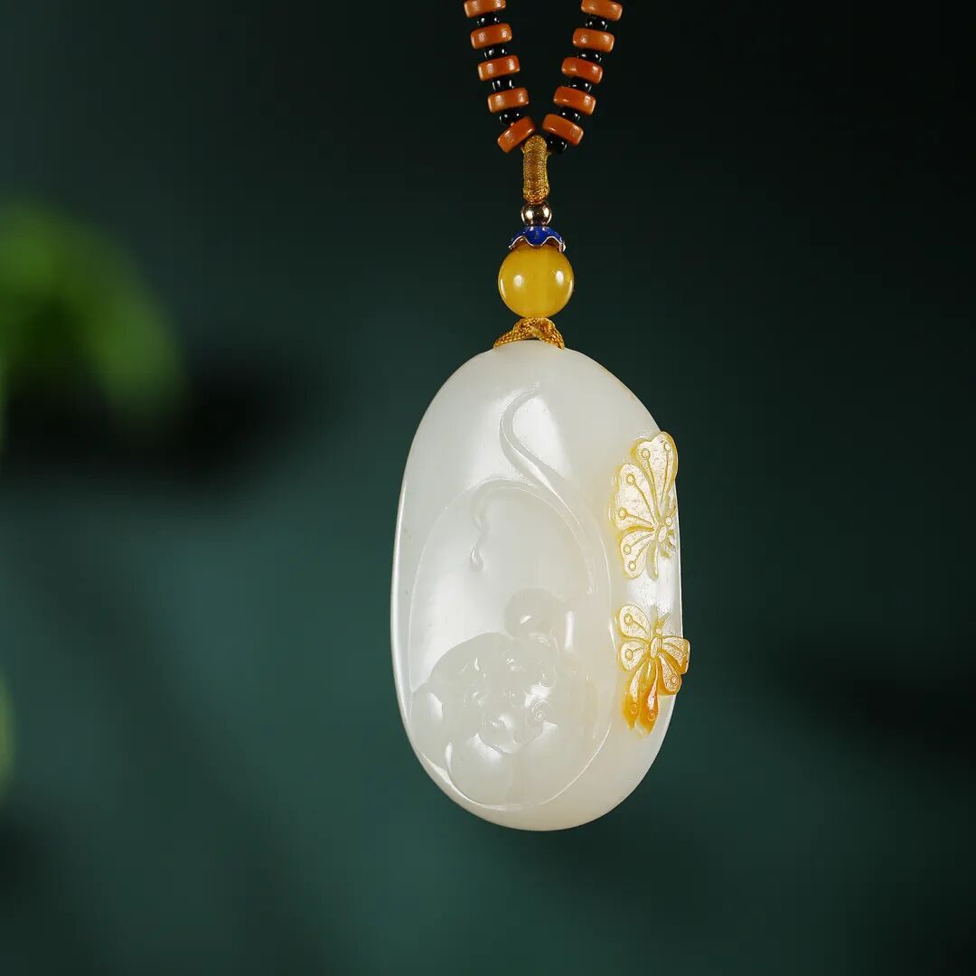 吉祥 洒金皮和田玉籽料蝶恋花俏雕挂件