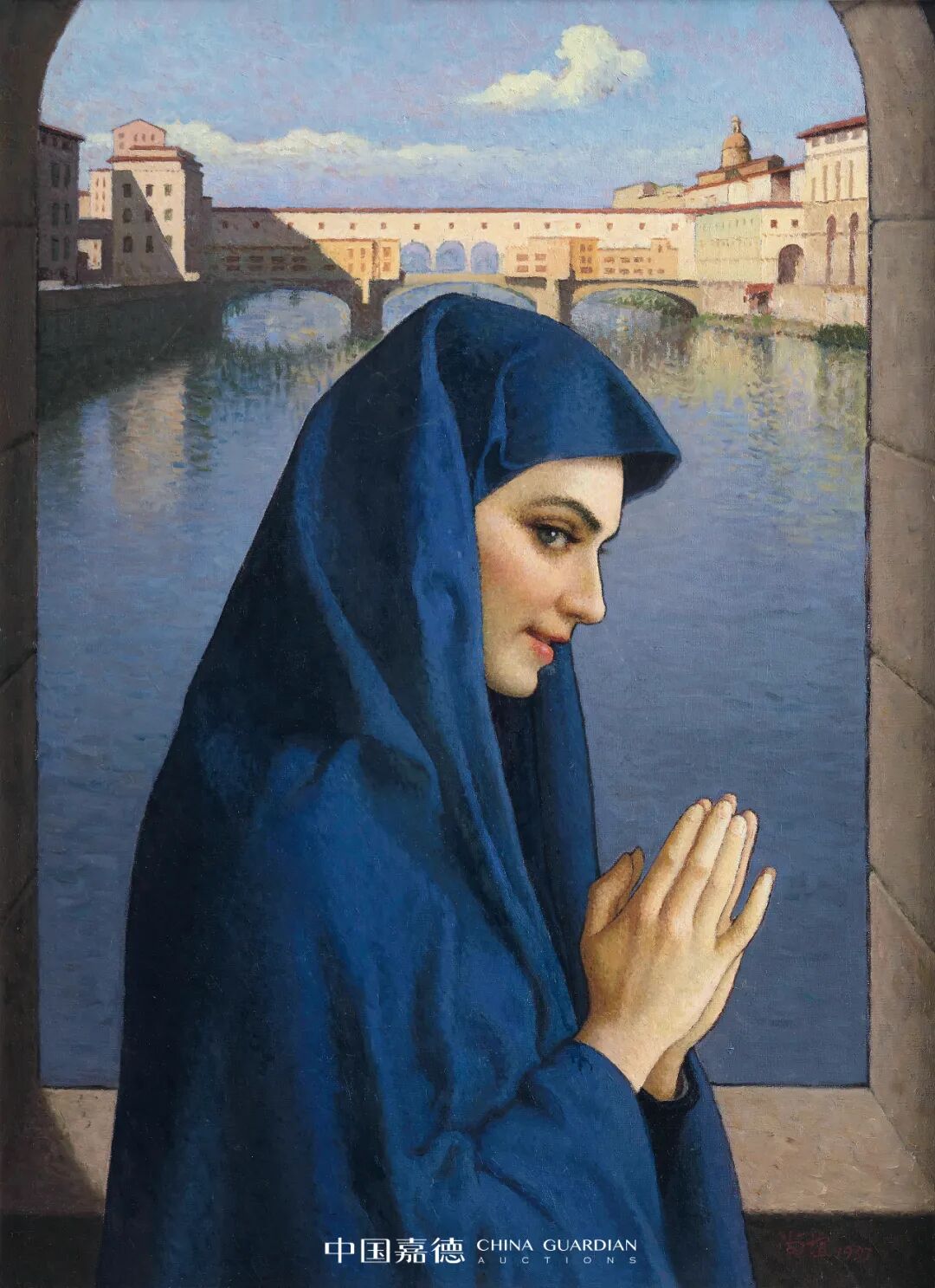 在靳尚谊看来,年轻一代的生活态度,反映了意大利社会古老与现代的矛盾,这一认识构成了《老桥东望》意图传达的主旨。画面背景中的老桥是位于佛罗伦萨城南的石桥,它横跨阿尔诺河,距今已有千年历史。相传文艺复兴诗人但丁就是在这座桥上与恋人贝雅特丽齐相遇。古老的石桥、平静的河水,实际上象征了意大利社会中古老、传统的事物。而前景中的人物则进一步丰富了画面的内涵。这名年轻的修女身着深蓝色长袍,双手作祷告状,眼神却瞥向了别处,嘴角不经意的一丝笑意打破了祈祷时庄严肃穆的气氛。这一微妙关系的揭示和呈现无疑得益于靳尚谊对于画中修女神态的细致刻画,而这主要通过画家对于形体边线的处理实现。靳尚谊在艺术实践中,始终力求把握内在理念与外在再现之间的平衡。他在早年就已经意识到从“结构”出发去观察、刻画形体的重要性。自1979年游历欧洲,遍访古典大师经典之后,靳尚谊进一步认识到界定形体范围的轮廓线之于形体塑造的重要性。