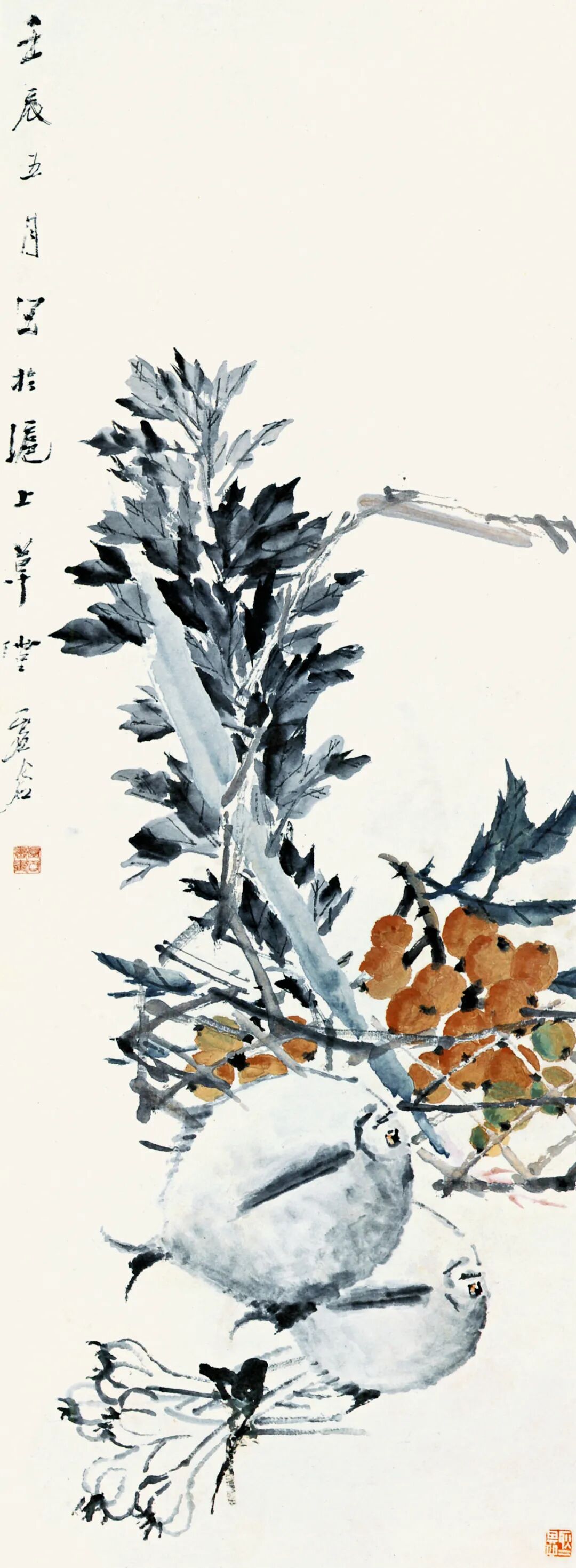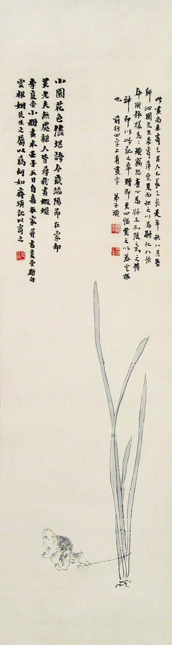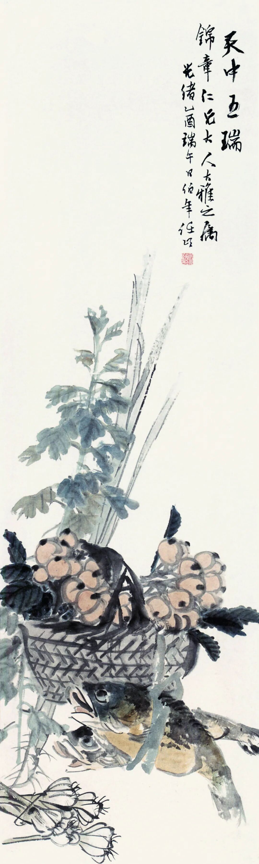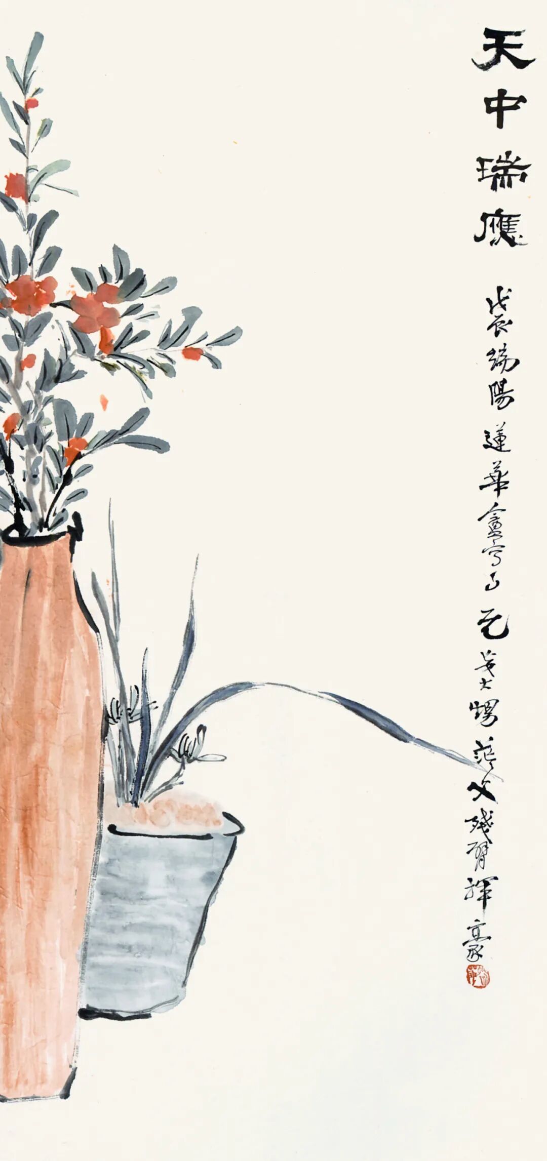 由姚茫父创作于1928年的《天中瑞应图》以清供的方式表现出瓶中石榴花与盆中兰草的怡人氛围,让端午节令题材也带有几分文人气。