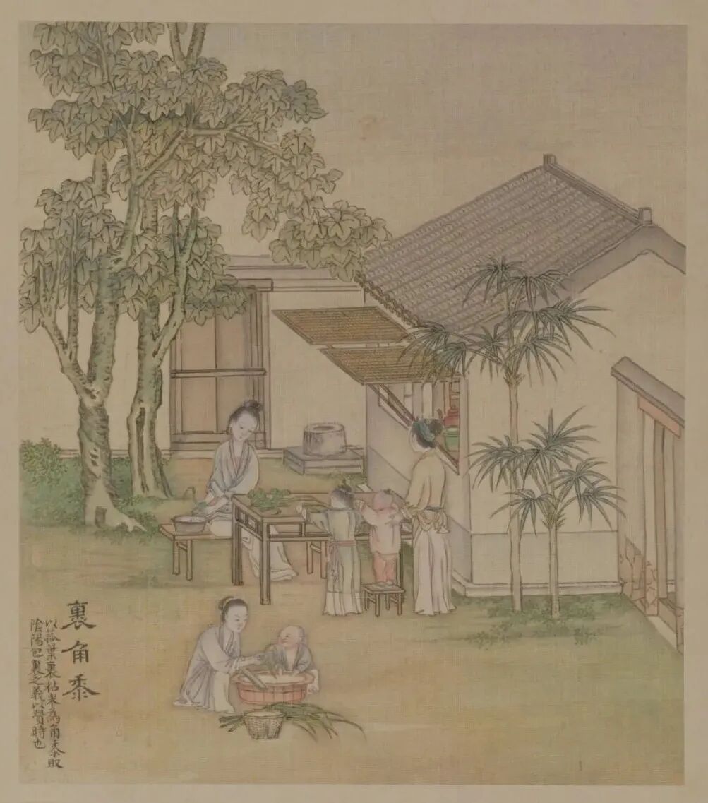 咸口还是甜口?三角形还是长条形?各地的粽子在馅料、包法上都有着地方特色,但在绘画中,往往都以墨线缠绕绿色粽身的形象呈现。除了粽子,端午节还讲究食用“五黄”——咸鸭蛋、雄黄酒、黄鳝、黄鱼、黄瓜,以及樱桃、荔枝、枇杷等应季蔬果,这些端午节物既是盘中美馔,也是画中常客。清代徐扬《端阳故事图册》中的“裹角黍”画面还原了当时包粽子的场景。