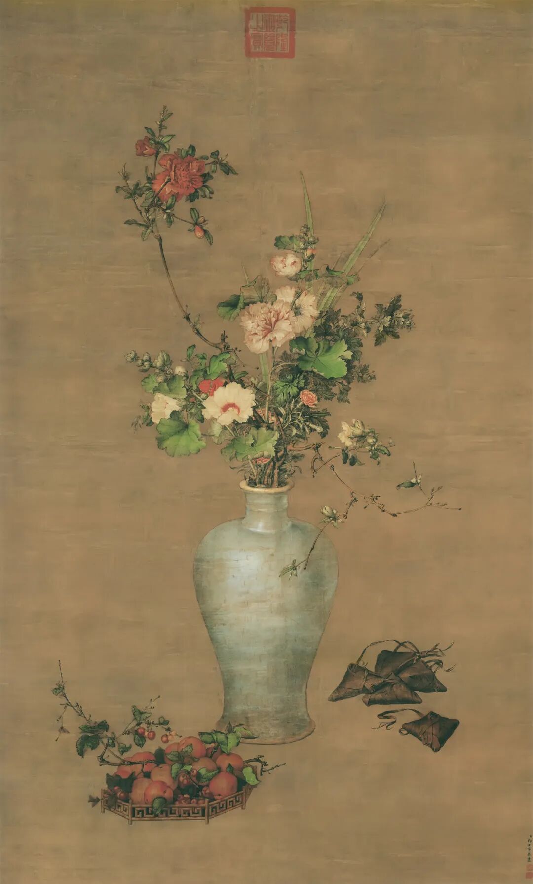 据清顾禄《清嘉录》记载:“五日,俗称端五。瓶供蜀葵、石榴、蒲蓬等物,妇女又簪艾叶、榴花,号为‘端五景。’”端午时节的“天中五瑞”通常指艾叶、菖蒲、石榴、蒜头、龙船花,它们的共性在于都具有强烈的气味,能起到净化空气的作用,又都是应季植物,随处可得。另外,蜀葵、栀子、百合等时令花卉也是“端午景”绘画中的常见品种。![]()