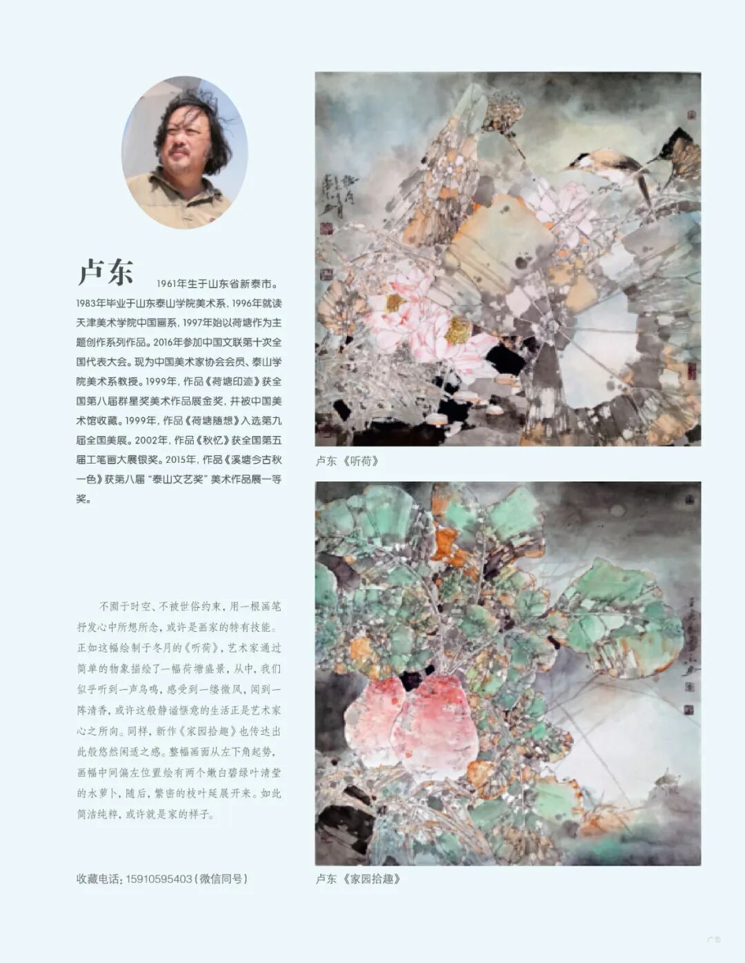 不囿于时空、不被世俗约束,用一支画笔抒发心中所想所念,或许是画家的特有技能。正如这幅绘制于冬月的《听荷》,艺术家通过简单的物象描绘了一幅荷塘盛景,从中,我们似乎听到一声鸟鸣,感受到一缕微风,闻到一阵清香,或许这般静谧惬意的生活正是艺术家心之所向。同样,新作《家园拾趣》也传达出此般悠然闲适之感。整幅画面从左下角起势,画幅中间偏左位置绘有两个嫩白碧绿叶清莹的水萝卜,随后,繁密的枝叶延展开来。
