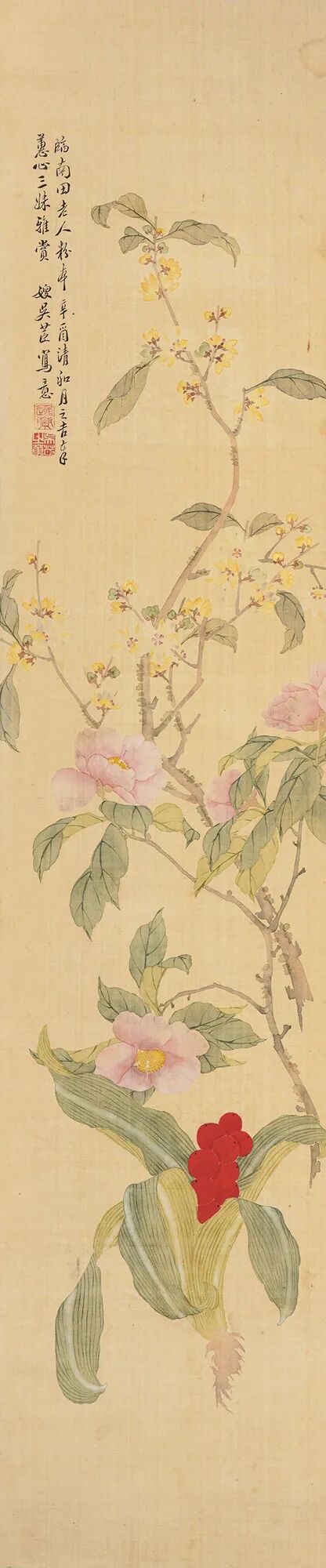 孙伴香(芸)妙擅丹青,才兼三绝,惟诸家画史均佚其名,遗迹从未一见。仅《墨林今画》云:“山尊贤妃,亦工花鸟,先殁”。又洪北江《卷葹阁集》:“嘉庆元年丙辰,赠吴孝廉鼒却扇诗云所娶为孙兵备妹”。而皆不举其名。得见此帧,名字始显其地与时,尤资佐证。