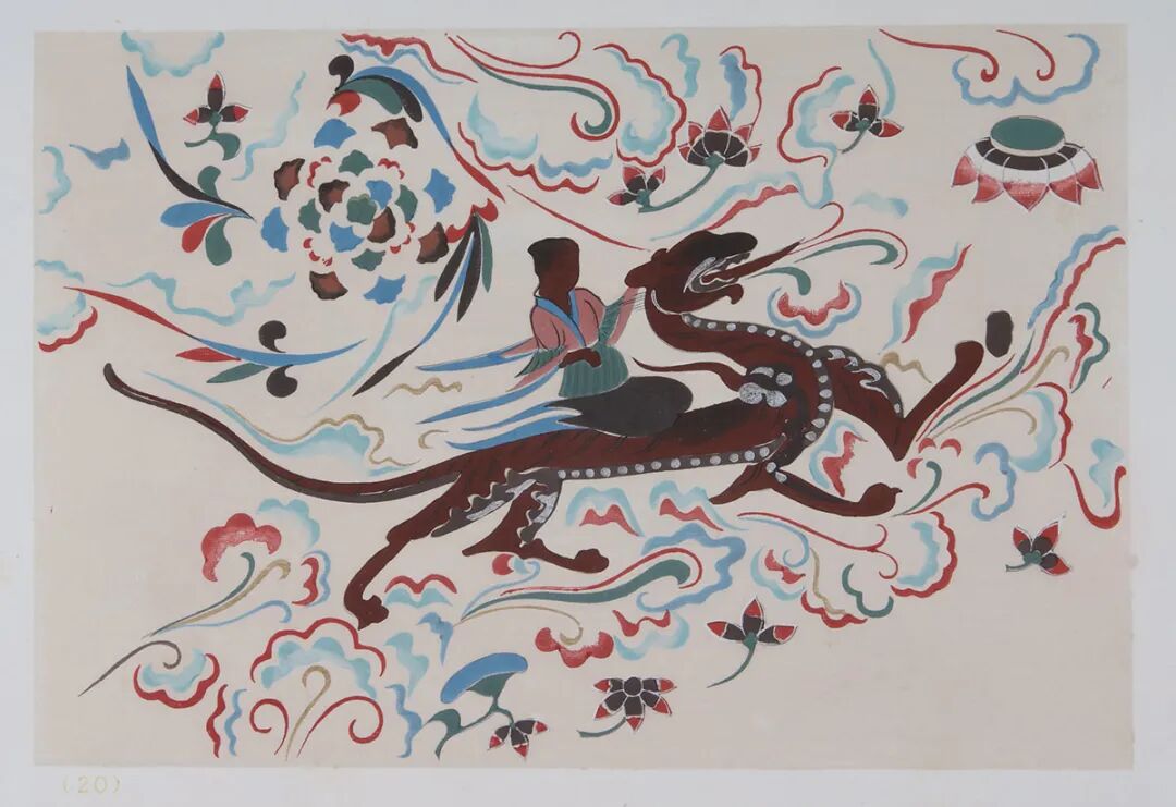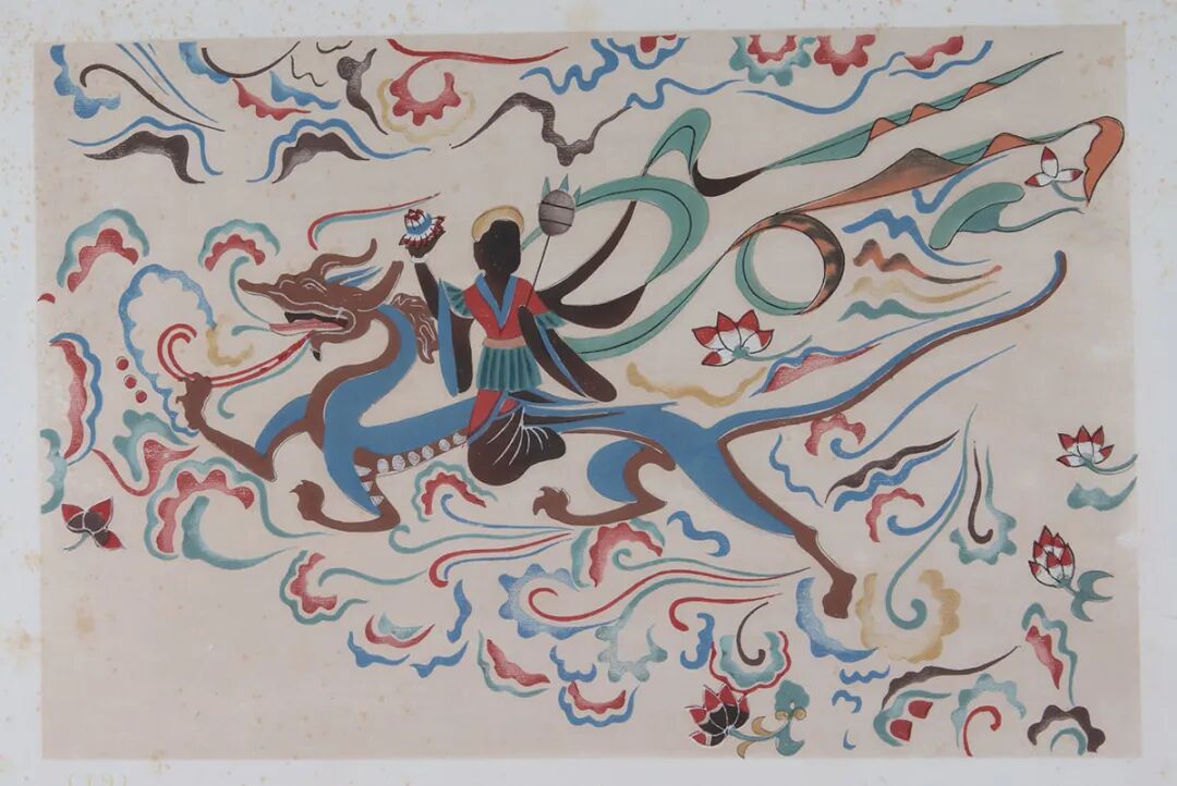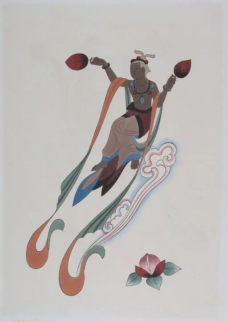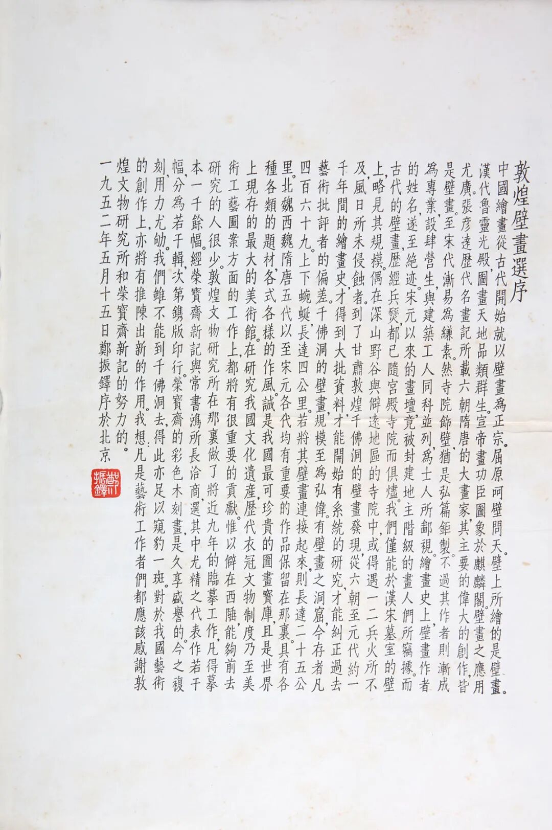 惟以僻在西陲,能够前去研究的人很少。敦煌文物研究所在那里做了将近九年的临摹工作,凡得摹本一千余幅。经荣宝斋新记与常书鸿所长洽商,选其中尤精之代表作若干幅,分为若干辑,次第镌版印行。荣宝斋的彩色木刻画,是久享盛誉的。今之复刻,用力尤劬,我们虽不能到千佛洞去,得此亦足以窥豹一斑。对于我国艺术的创作上,亦将有推陈出新的作用。我想凡是艺术工作者们都应该感谢敦煌文物研究所和荣宝斋新记的努力的。
