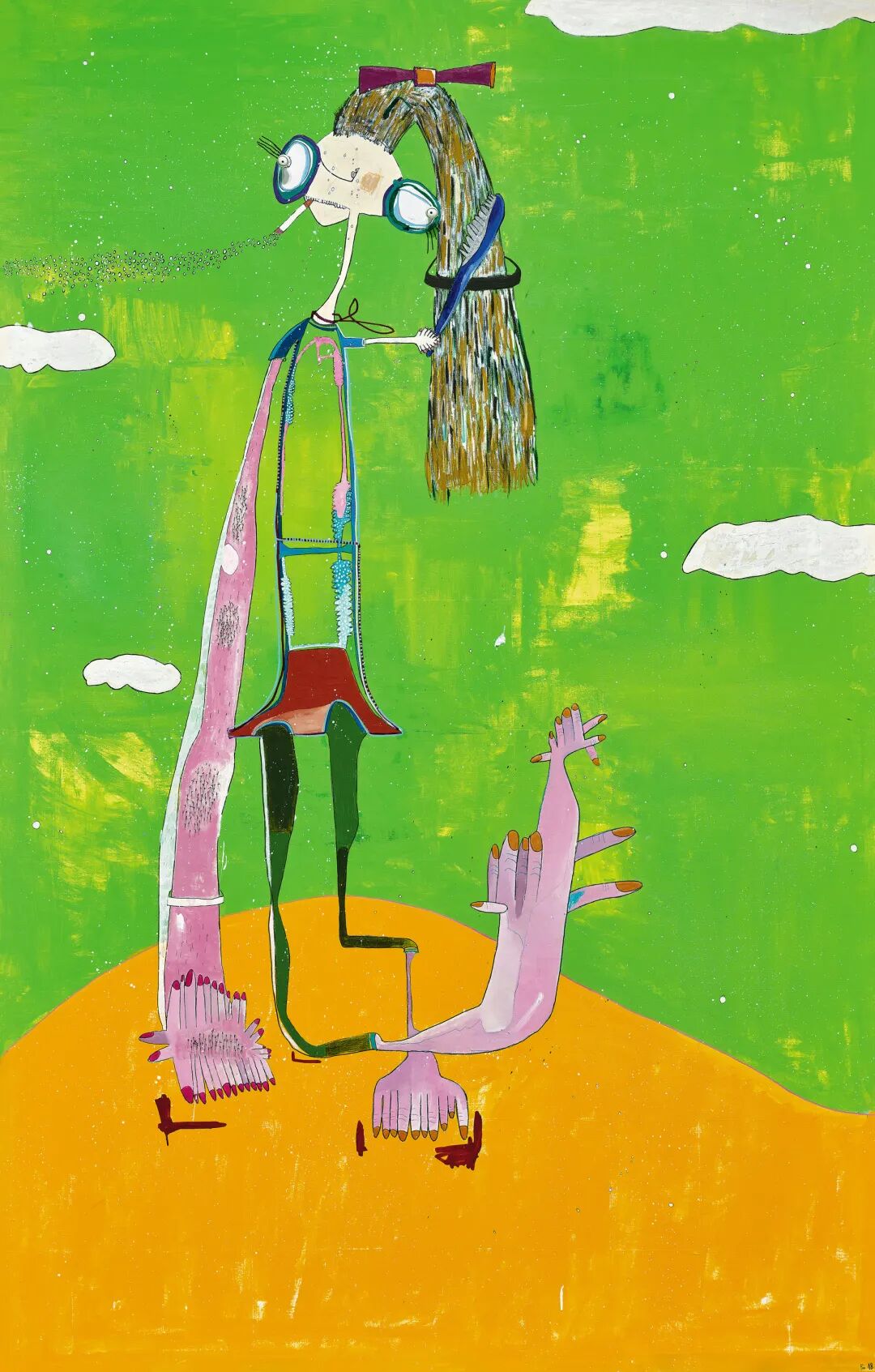 《尼娜》可見藝術家已趨於成熟的淋漓揮灑的藝術風格,畫面以鮮明的黃綠為背景,主體似乎是一位正在梳理頭髮的女孩。人物結構以簡明活躍,有如鋸齒般的線體描繪,人物的右手是巨大的肢幹,延伸出繁密的手指,與之強烈對比的是左手纖細的軀幹,舉著梳子正在梳理頭髮。畫面中人物正啖著香煙,這也是藝術家筆下人物常出現的元素。眼睛由立體拼貼構成。細長的脖子,不成比例的軀幹和五官,藝術家筆下的人物似乎在悠閒地抽著煙,梳理自己的頭髮,可謂獨樹一幟而又不失輕鬆可愛的氛圍。
