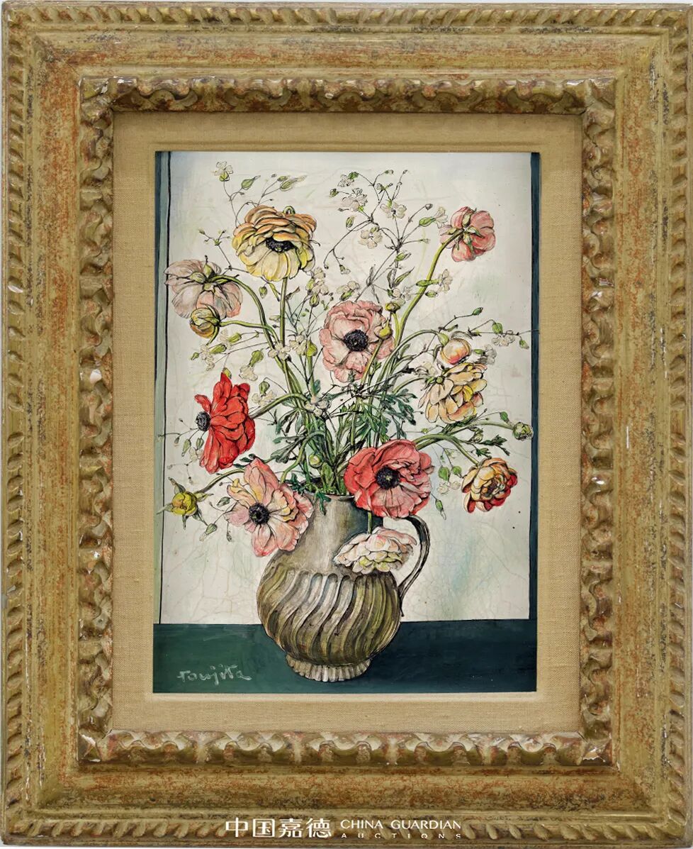 1950年代,重回巴黎的藤田嗣治一改早期的华丽风格,将对间美好和平的憧憬融于花卉和孩童题材中,其艺术创作也由此升华至新的高度。本场呈现的《花瓶里的花束-致敬弗拉芒大师》即是其晚年花卉作品中的代表,藤田嗣治在本作中致敬欧洲静物画先驱老安布罗休斯·博舍特,以标志性的细笔描绘了盛放在花瓶中的银莲花。本作虽是油画作品,但藤田嗣治却以之描绘出水彩的通透感,将水彩轻盈的光影以及线条美,抒展在油彩画上,藤田也用银莲花隐喻了他一生颠沛流离的境遇,极具自传性。《花瓶里的花束-致敬弗拉芒大师》在完成同年,就参加了巴黎Pétrides画廊的藤田嗣治个展,沉潜一级市场60余年后方首现拍场,而此作也将收录于Sylvie Buisson即将出版的《藤田嗣治全集—第四卷》当中,珍贵性不言而喻。