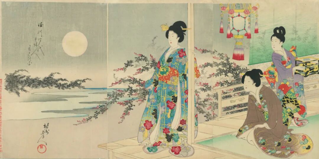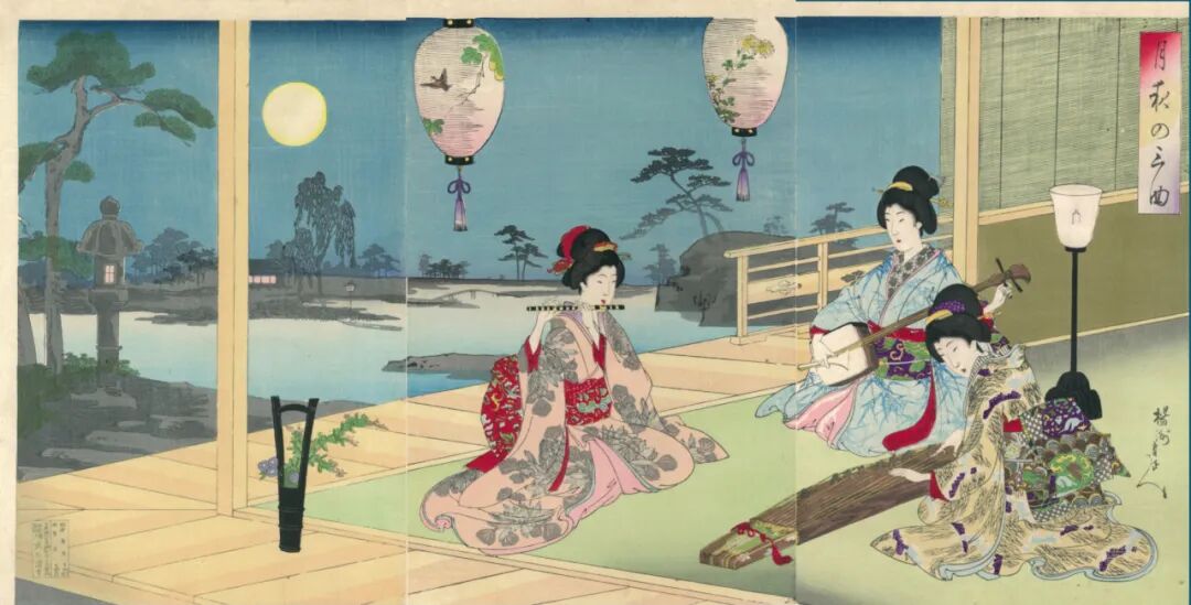 对于季节的敏感和关照,在日本艺术中多有呈现。一如本作的细节——灯笼上绘制的丝瓜(7~9月成熟)和菊花表明时节正当秋日。左图画面的一轮满月想必是十五的月亮吧。长方形的画面中,露台斜向延伸,将画面分成两半三角形,一半夜景,一半美人;而三美人的位置关系也形成一个三角,三人相对而席,乐声向庭院散去;园中一汪浅池叫玉盘照得发白,佐以月秋三曲,百年前的清凉透过画面扑面而来。
