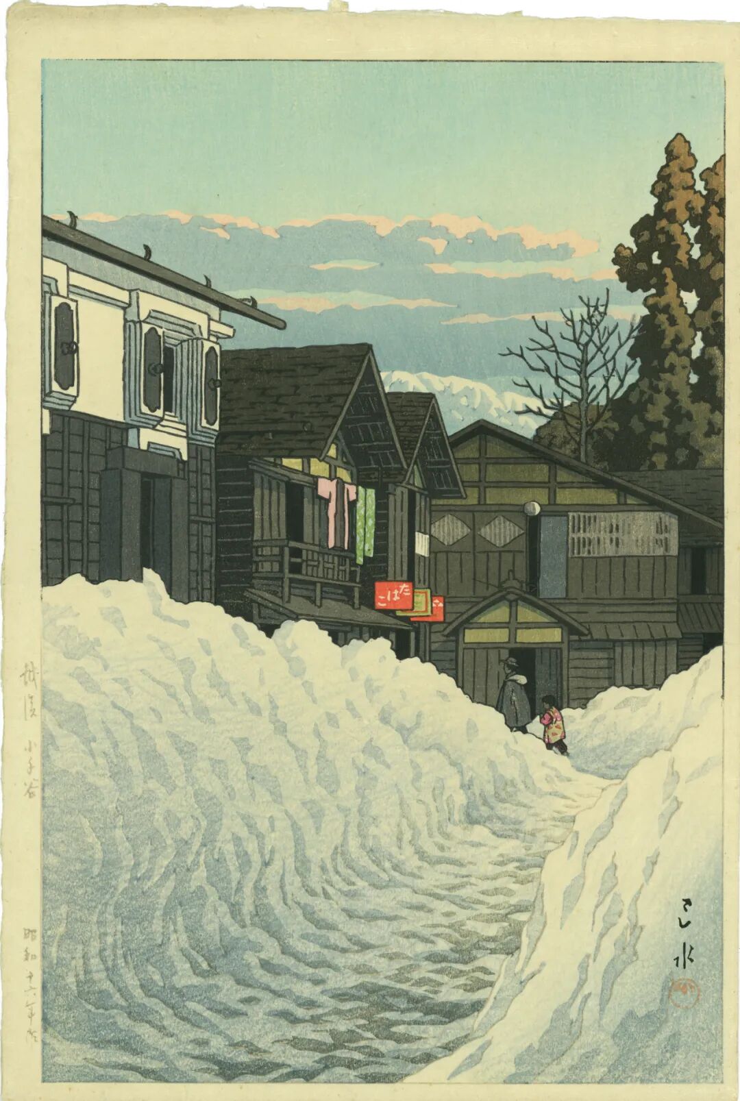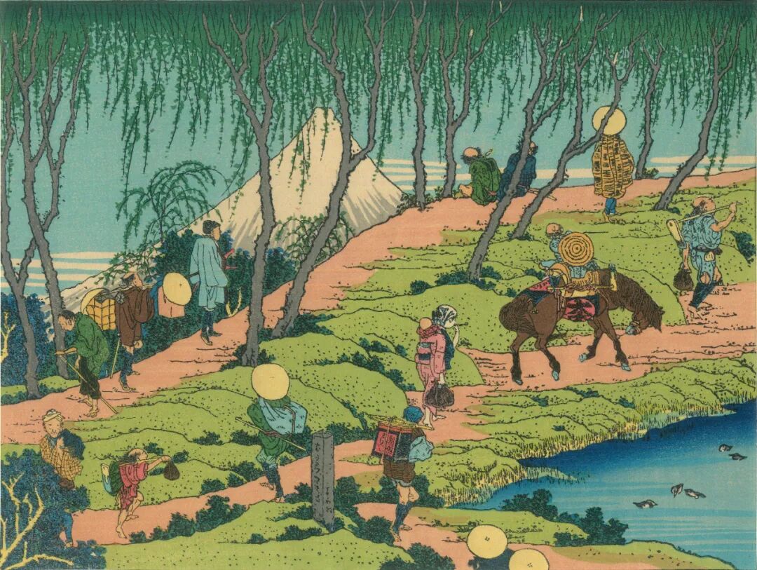北斋对于寻找新的艺术技法和灵感充满热情,也尝试过各种各样的西方技法。通过对西洋画的不断探索,成就了《东海道四谷十二社》这幅杰作,而这幅画也被认为是葛饰北斋结合东西方绘画技法最为出色的风景版画。这幅画别具一格的对比构图应该是从法国画家普桑的风景画中获取了灵感,但是其线条与风格仍旧是东方式的。画面在光影对比和透视的技法上十分精致严谨,而且,在画面左上方的横式署名,也会让人很自然地联想到西方绘画。这部作品是由高见泽木板社制作,复刻世家大师高见泽忠雄监修的版本,画面右侧印有“高见泽忠雄”印章,十分珍贵。![]()