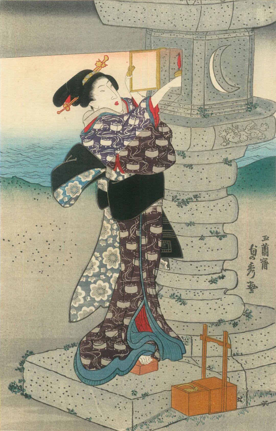 歌川贞秀被称为“横滨画的第一人”,他的美人画清新悦目,受到极大关注。这幅《点石灯笼的女子》是他美人绘的代表作之一。画中描绘了一个平民女子正在入夜时分点燃高大的石灯笼。周到的细节和细致入微的人物表情反映了江户时代日本平民的生活习俗,受到师傅歌川国贞的影响,人物造型也是“国贞式”的体长足短的“猫背猪首”样式。贞秀的美人画极具生活气息,与前辈鸟居清长、喜多川歌麿等人的典雅风格不同,更贴近平民审美趣味。