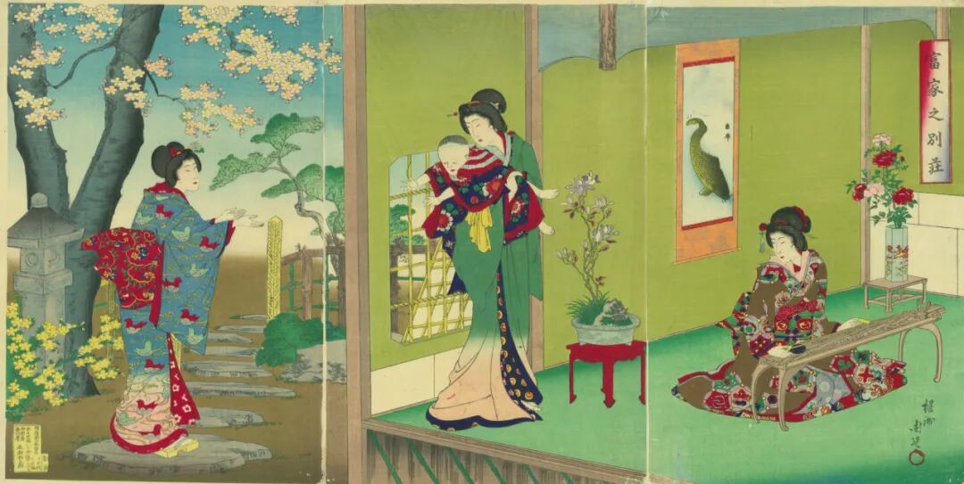与周延同时代的美人绘画师不在少数,但像周延一样笔墨精妙的少之又少;他们的作品往往不能够准确描绘上流女性的常活,禁不住推敲,想必他们是将在烟花柳巷里所见的妩媚融入笔尖,使得日后即使是不了解日本历史文化的浮世绘爱好者也能觉出一丝不和谐,或者说是艳俗。周延作为武士阶级出身,有机会接触到上流社会之人。他将自己所见的贵族女性的生活记录在一篇篇浮世绘作品之中。本作虽题为“富家之別莊”,但从画面中寻不得特别高调显富的元素——中国样式的猫脚台不是漆器,盆栽花瓶不是华丽的萨摩烧,壁龛也是最基础的设计。乍一看,实在看不出“富家”富在何处。实际上,江户时代幕府推动“禁奢令”,其中条项规定复杂,归根结底就是禁止奢侈。简单清雅的装潢受到富裕阶层的广泛应用,所以周延所描绘的这件作品是江户时代真真正正的富家模样。值得提的是,壁龛中挂有幅鲤鱼立轴,竟带有落款“应举”(日本江户时期画坛名家圆山应举,圆山四条派始祖)。带落款的挂轴在浮世绘中十分罕见,周延在此作中低调插入一件大名家的作品,以此来衬托富家不凡的收藏趣味。