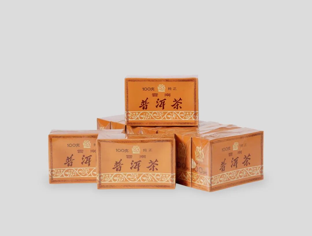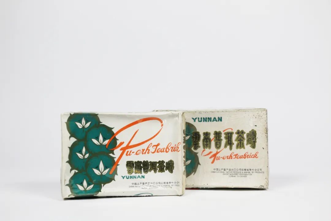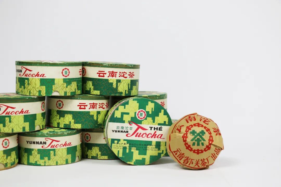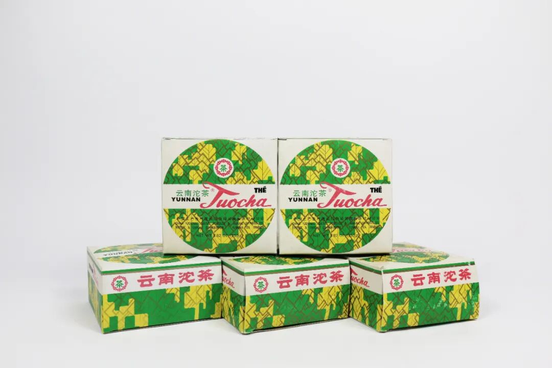 八十年代销法沱,黄绿色花格印刷包装,外盒上法语的“TH”(茶),花体的“Tuocha”字样都是销法沱的标志性特征。销法沱选用云南大叶种晒青毛茶为原料,经拼配、筛制、发酵、蒸揉、压制而成,外形紧结端正,松紧适度属于普洱茶熟茶,汤色褐红,醇厚陈香,其茶韵、茶香、茶味、茶气等是中国普洱茶的典型代表。