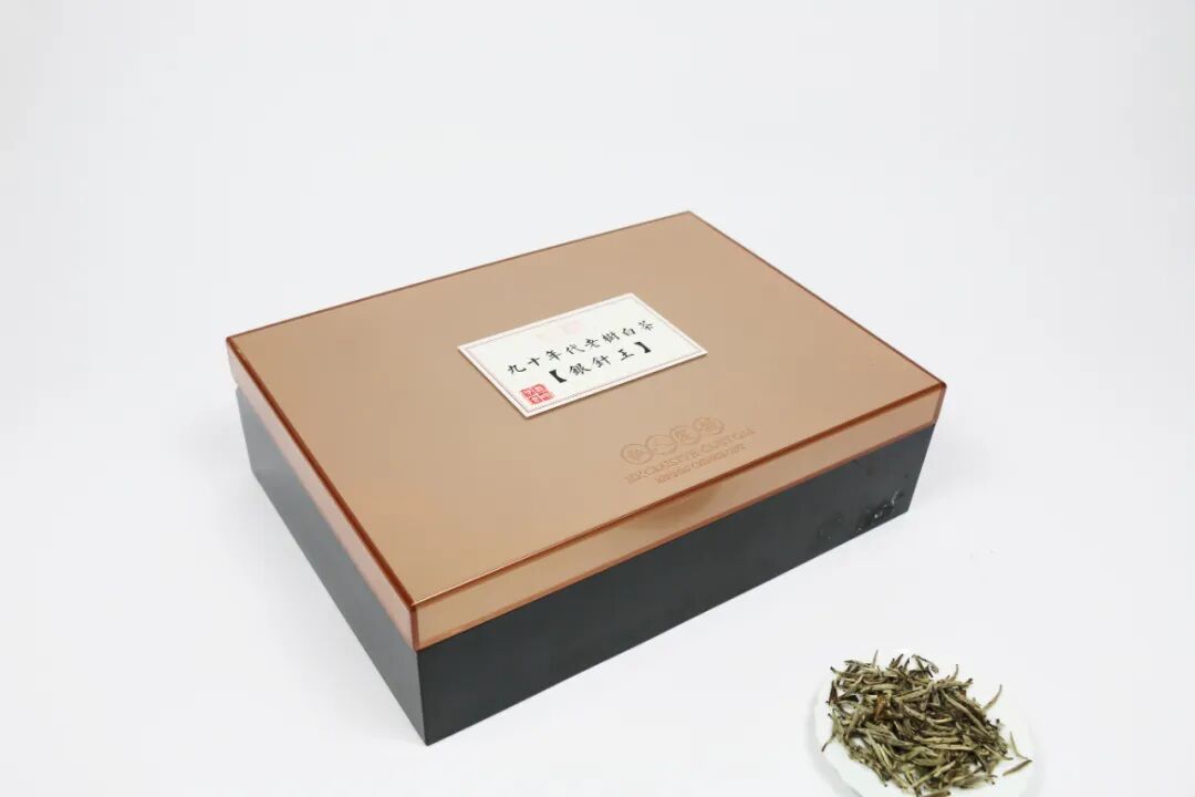 白毫银针,创制于1796年,属于中国六大茶类之一的白茶,有中国十大名茶的称号,素有茶中“美女”、“茶王”之美称。其外观特征挺直似针,满披白毫,如银似雪。由于鲜叶原料全部是茶芽,白毫银针制成成品茶后,形状似针,白毫密被,色白如银,因此命名为白毫银针。本品为九十年代银针王,采摘于高山老树茶,其芽头肥壮,遍披白毫,挺直如针,色白似银,冲泡后花香持久,汤色浅黄明亮,滋味清醇微甜、回甘持久。