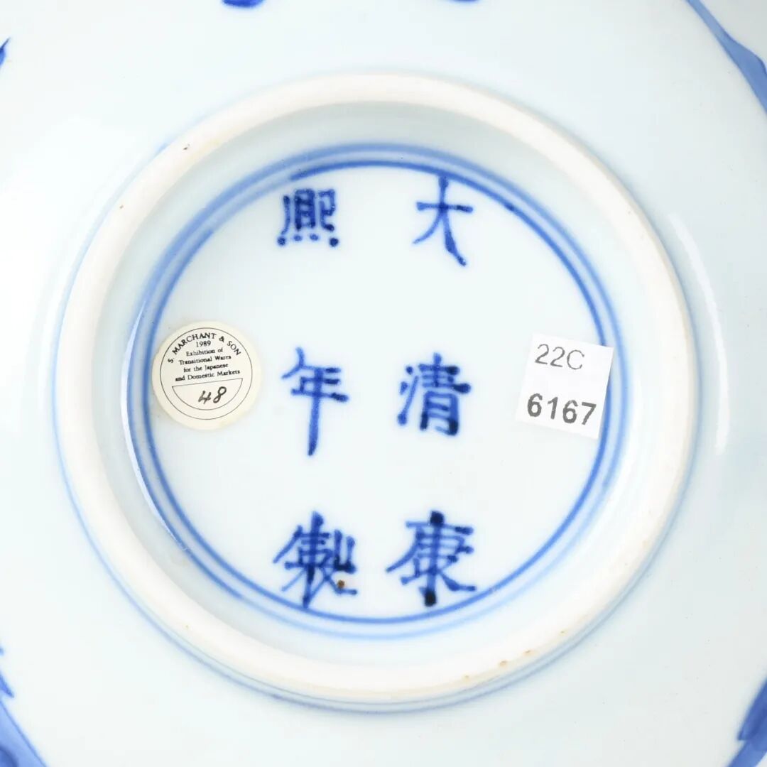 此件拍品敞口微撇,弧腹,下承圈足,通体施白釉,内壁青花绘海屋添筹神仙人物故事图,乱石嶙峋,三高士立于岸边,一人欲掷筹,一人转身回望,另一人持筹静待,童子侧立身后,仙鹿昂首扬蹄,隔岸一楼阁,内有圆筒置筹,楼阁上方,仙鹤衔筹,徐徐飞来,外壁青花绘山水人物纹。外底心青花双圈内书“大清康熙年制”六字双行楷书款。此件器型见《上海博物馆与英国巴特勒家族所藏十七世纪景德镇瓷器》编号76,唯底书青花“大清丙午年制”纪年款,再参看本件盘底落款之笔法,古朴苍劲,可类比馆藏顺治款官窑瓷的写法,可见本件拍品亦当为康熙早年之作。