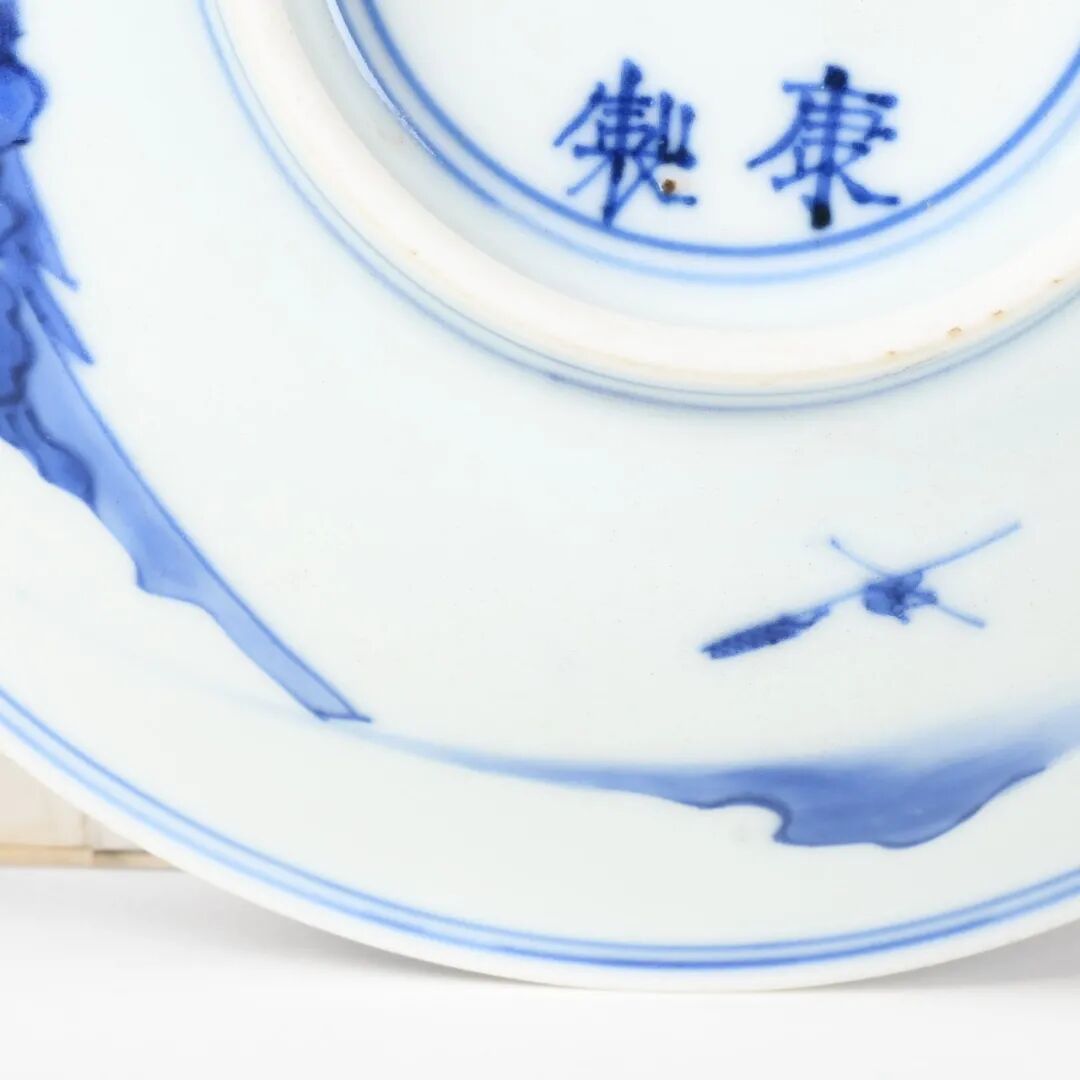 康熙青花多使用珠明料和浙料等国产青料,烧制出被誉为“翠毛蓝”、“宝石蓝”的发色效果,青翠明快、赏心悦目。构图多宗法宋、元、明以来的传统,以四季风光和远山近水为题,有的加绘人物,如读书、下棋、观瀑、野外漫游、泛舟、访友等纹饰,由于康熙青花发色明快淡雅,较贴近现代藏家审美近年来也受到众多藏家追捧,价格也随之水涨船高,本件青花海屋添筹图盘具有很好的收藏价值和观赏价值。
