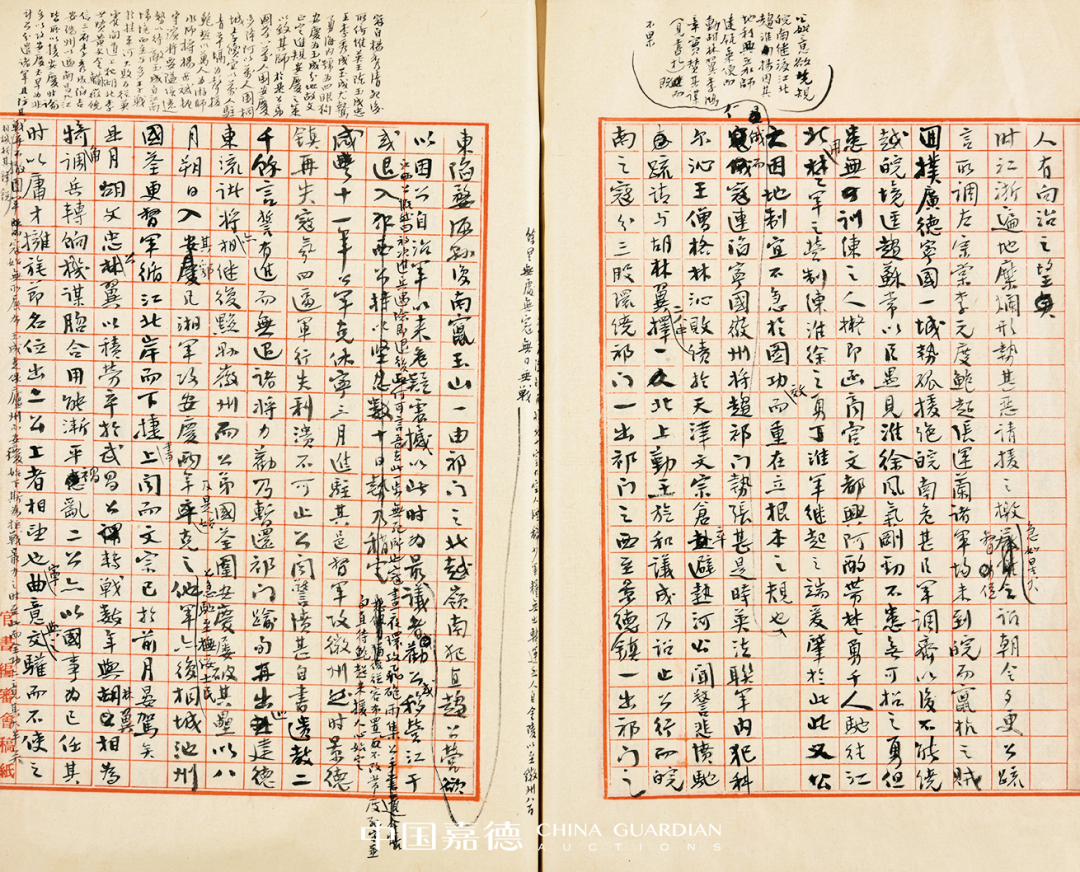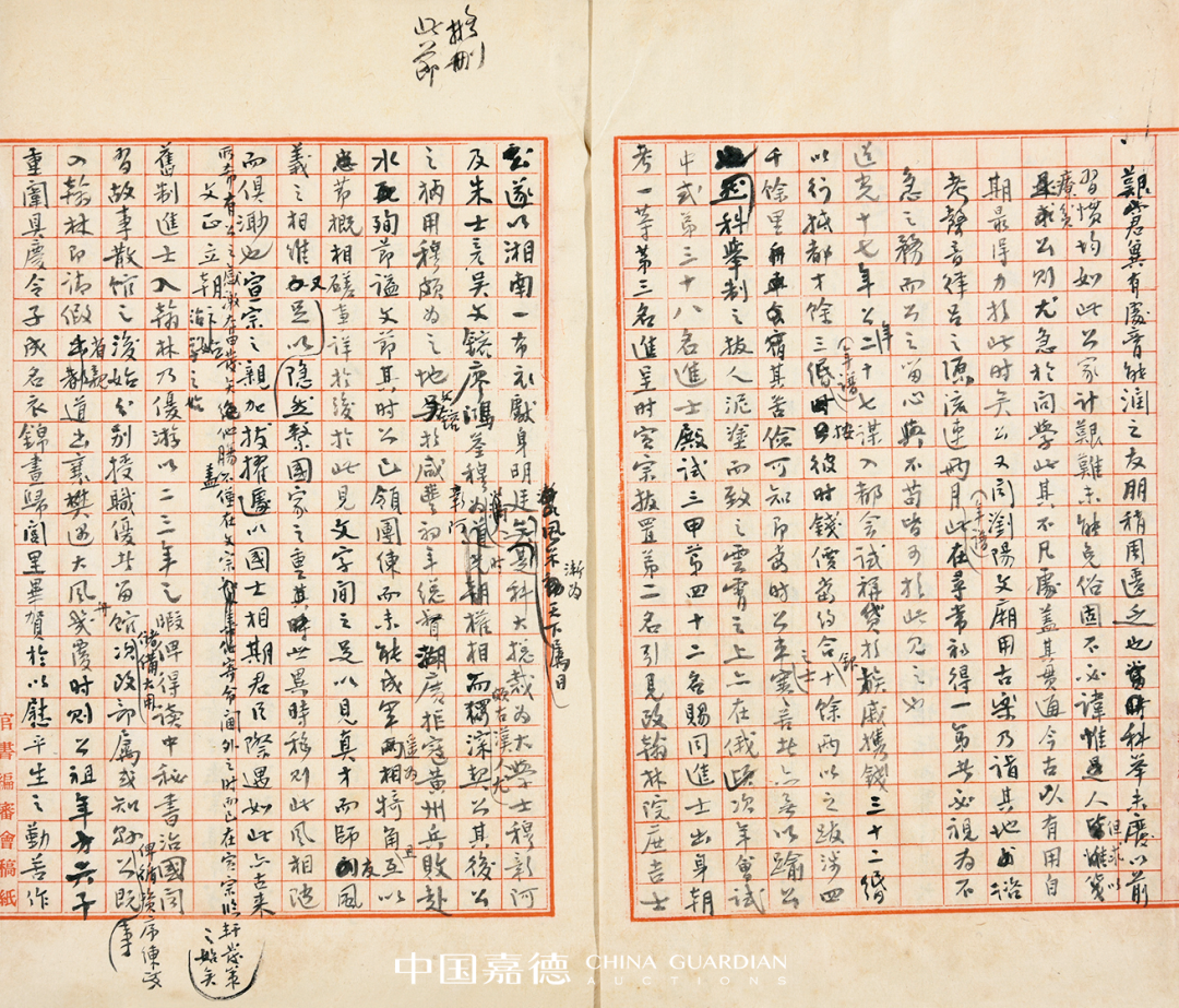 此件所用为官书编审会红栏格稿纸。文稿从文正降生之时代背景、文正之世系与少年为学、文正立朝治学之始、文正起兵之艰难、湘军之东下、文正之讨捻、文正之晚节、文正治军从政之规、文正论学之旨、文正之用人与爱士、文正持躬治家之节等,详述曾文正公世系、从军从政、治学治家诸方 面,附师友言行录,并批注有“一下均低一格写”、“此行顶格写” 等誊写要求。