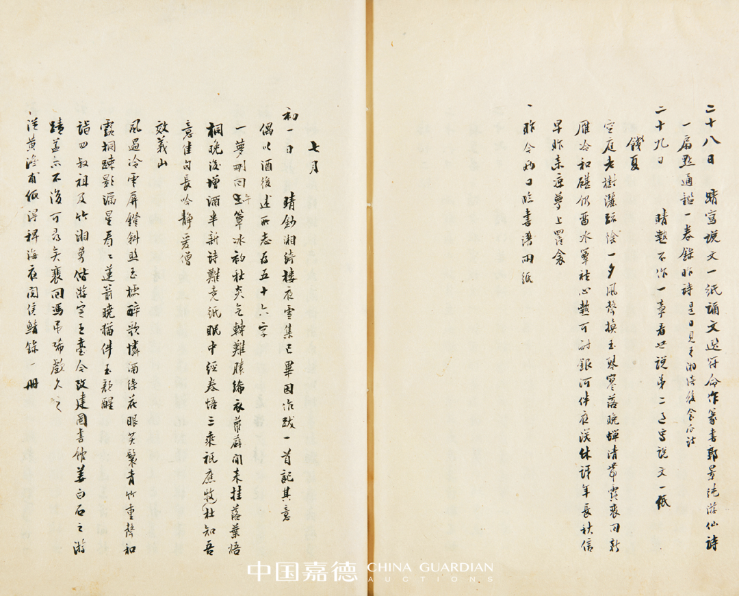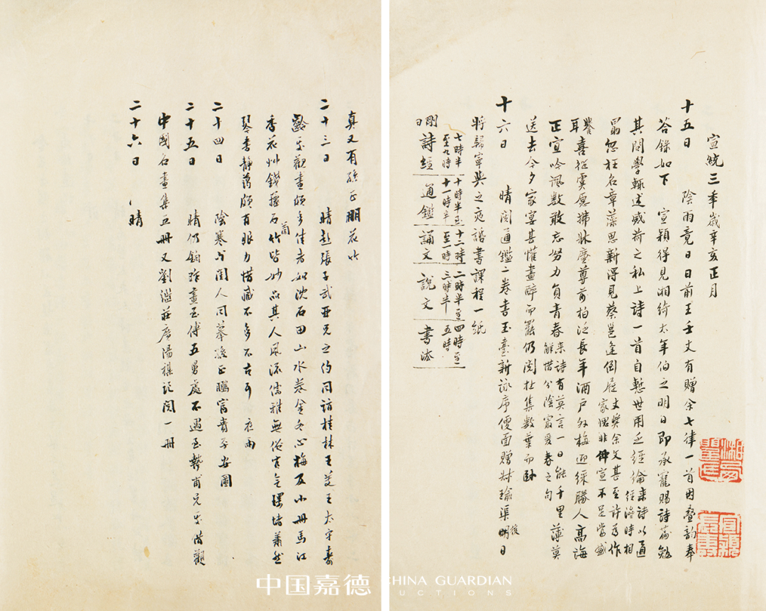 此件封面题“辛亥 年双海棠阁日记”,记事时间始于宣统三年(1911)正月十五日,止于七月二十六。时年十八岁、刚刚新婚的瞿宣颖在日记中记录了与其师王闿运的诗词唱和,读书临帖的学习日常,夫人归宁、共读通鉴的 琴瑟相调,外祖姑张太夫人丧事等琐碎家常种种。